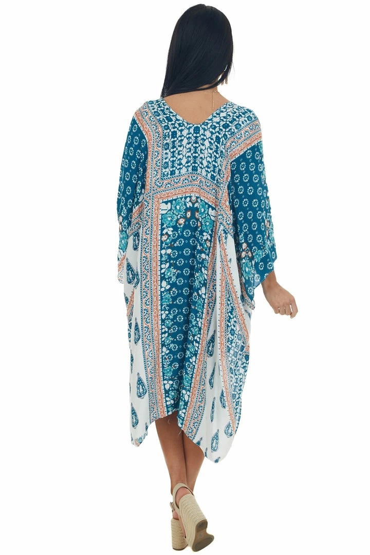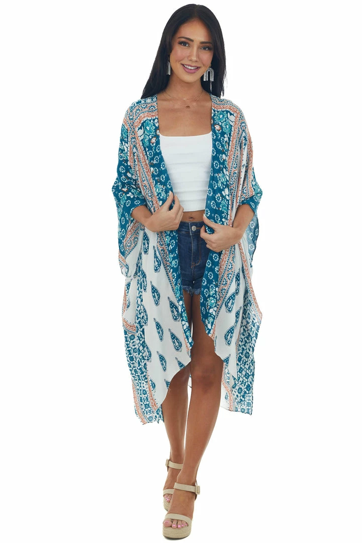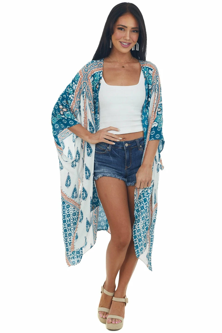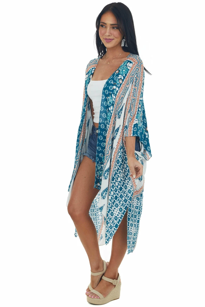 - Ivory Multiprint Kimono with Deep Side Slits