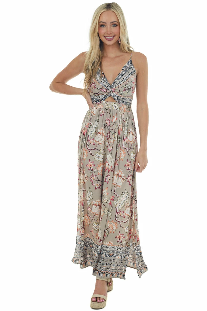 - Khaki Floral Maxi Dress with Aztec Border