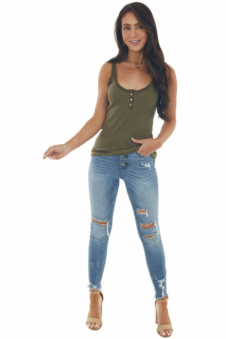 - Olive Ribbed Knit Tank Top with Button and Lace Trim Details