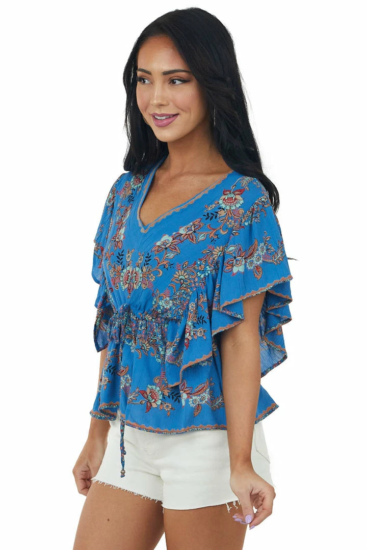 - Dusty Blue Floral Ruffle Elastic Waist Tie Top