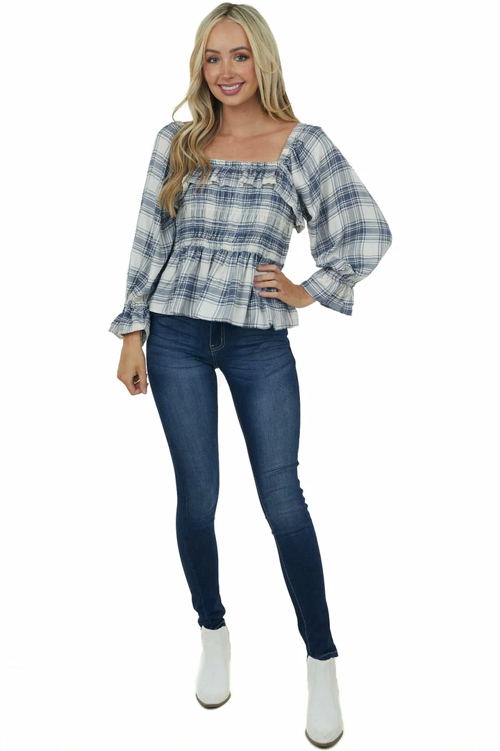 - Faded Navy Plaid Long Puff Sleeve Peplum Top