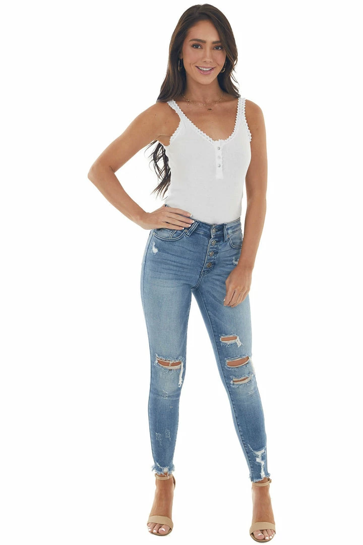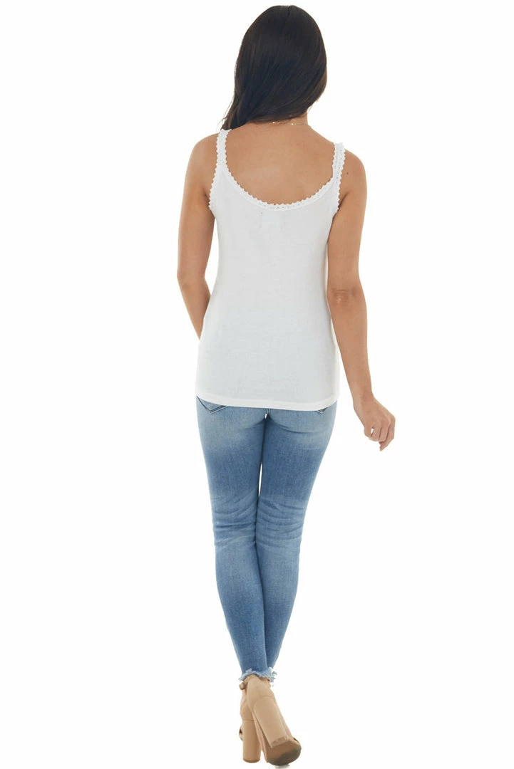 - White Ribbed Knit Tank Top with Button and Lace Trim Details