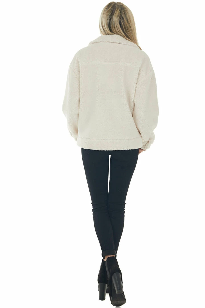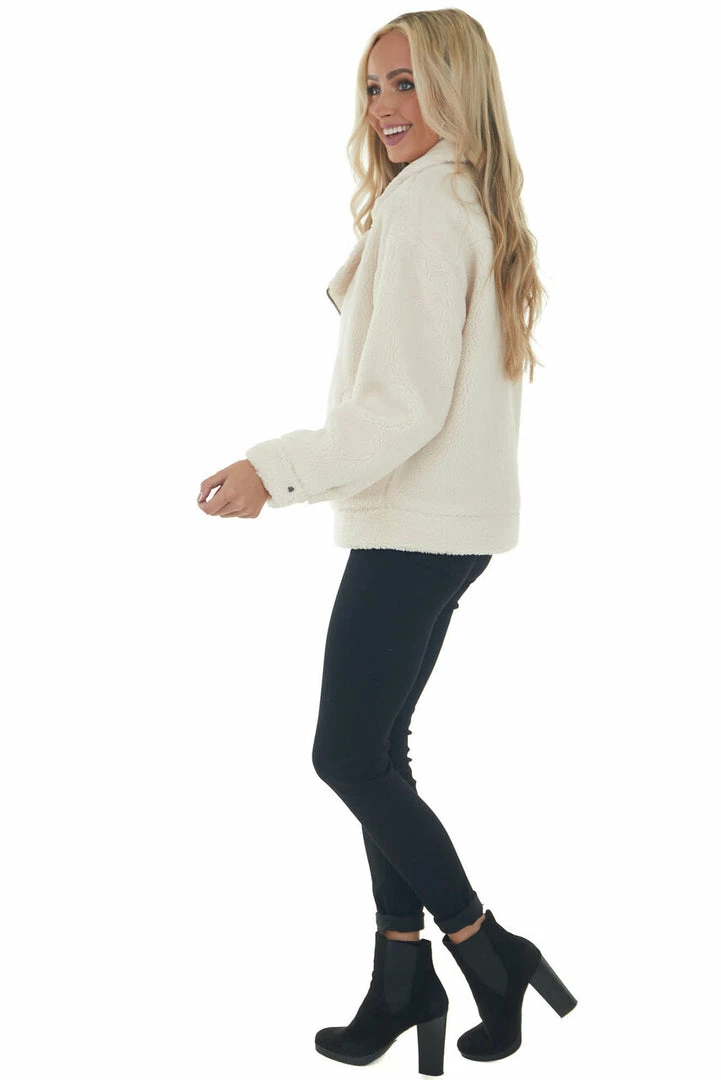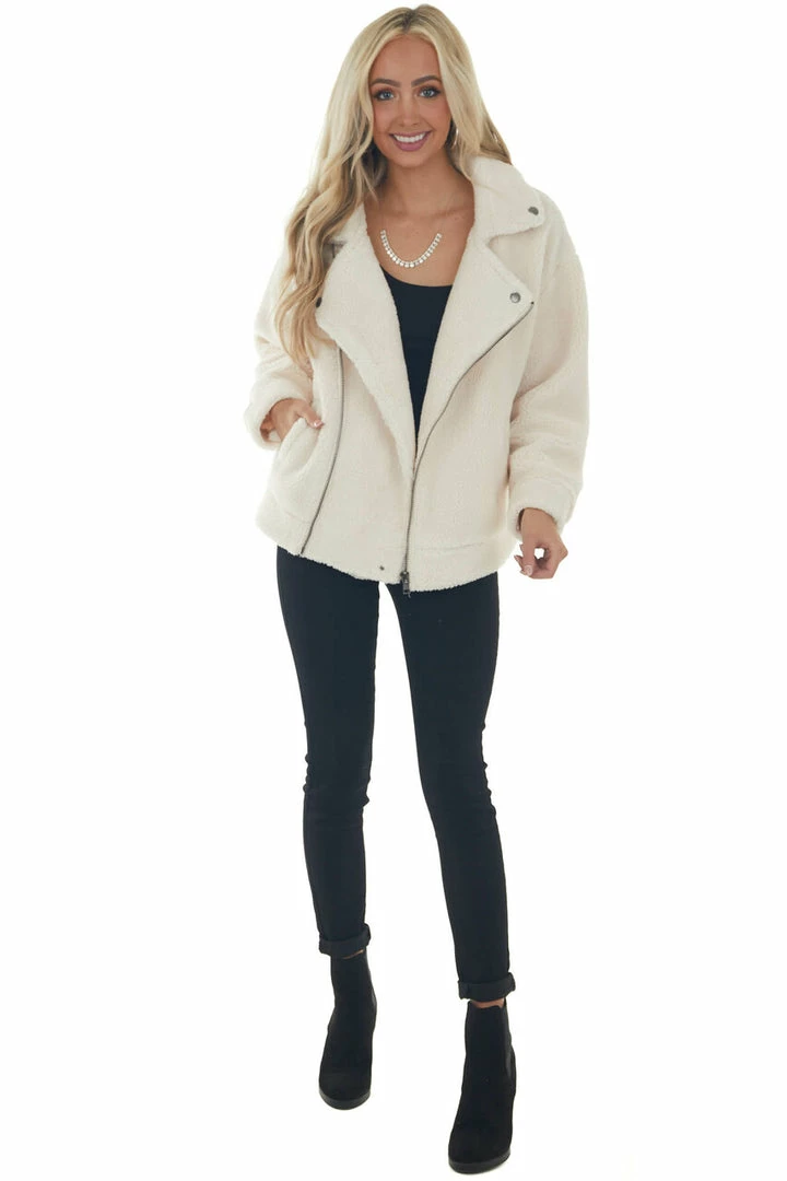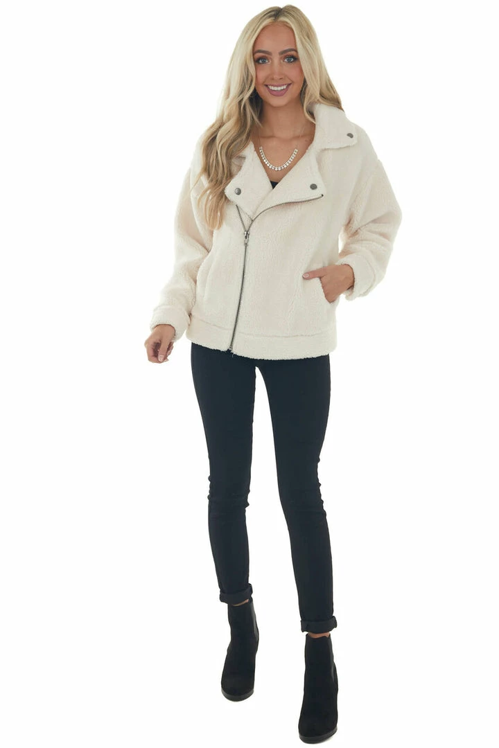 - Cream Faux Fur Long Sleeve Zip Up Moto Jacket