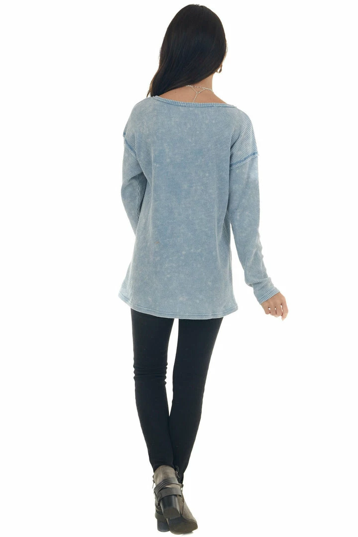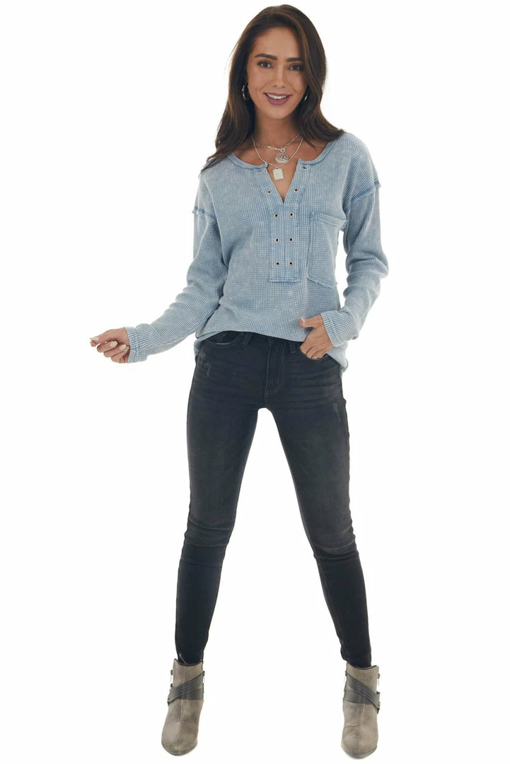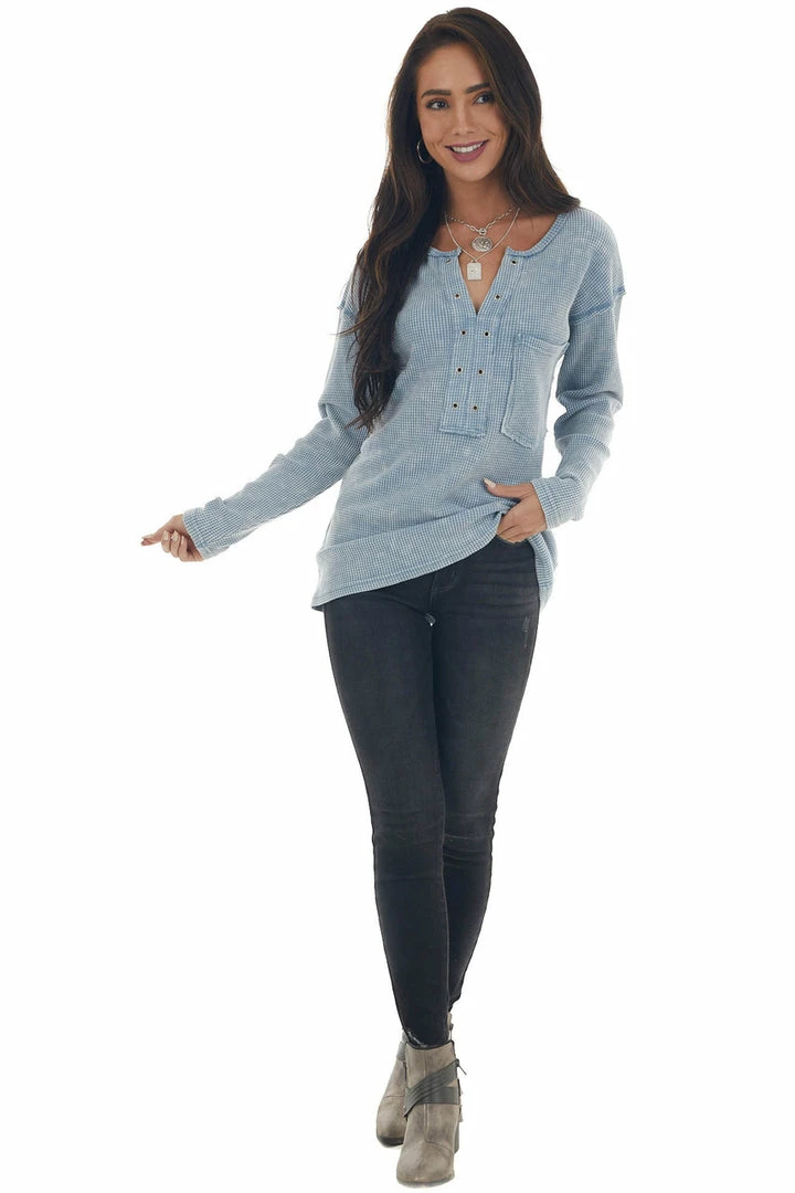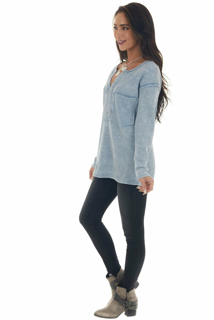 - Baby Blue Washed Thermal Knit Chest Pocket Top