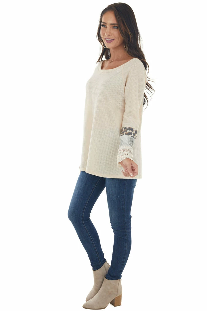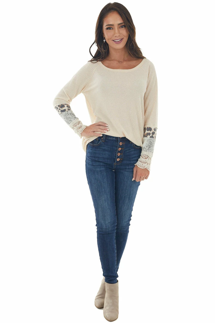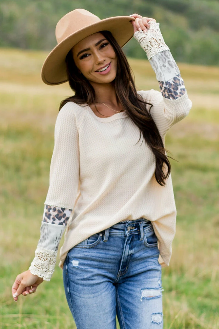 - Beige Long Sleeve Waffle Knit Top with Multiprint Cuff