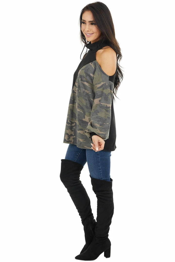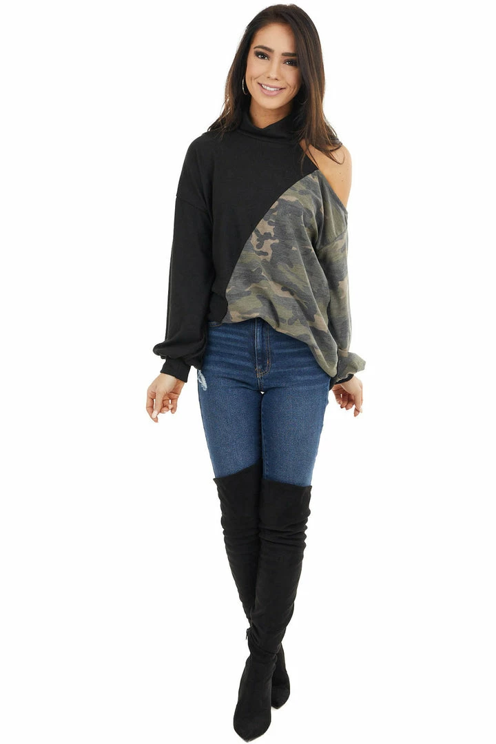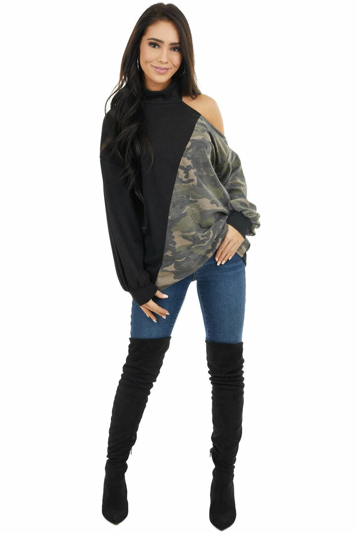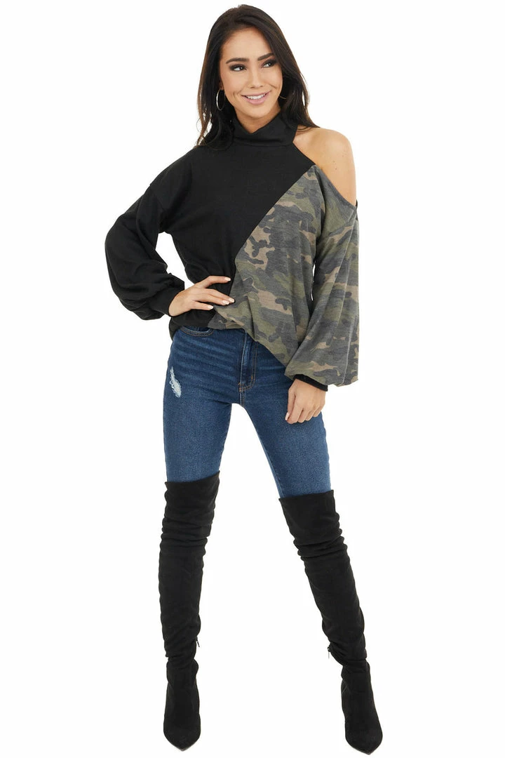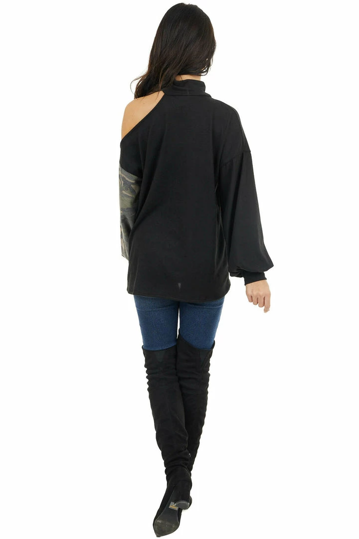 - Black Cold Shoulder Long Sleeve Top with Camouflage Contrast