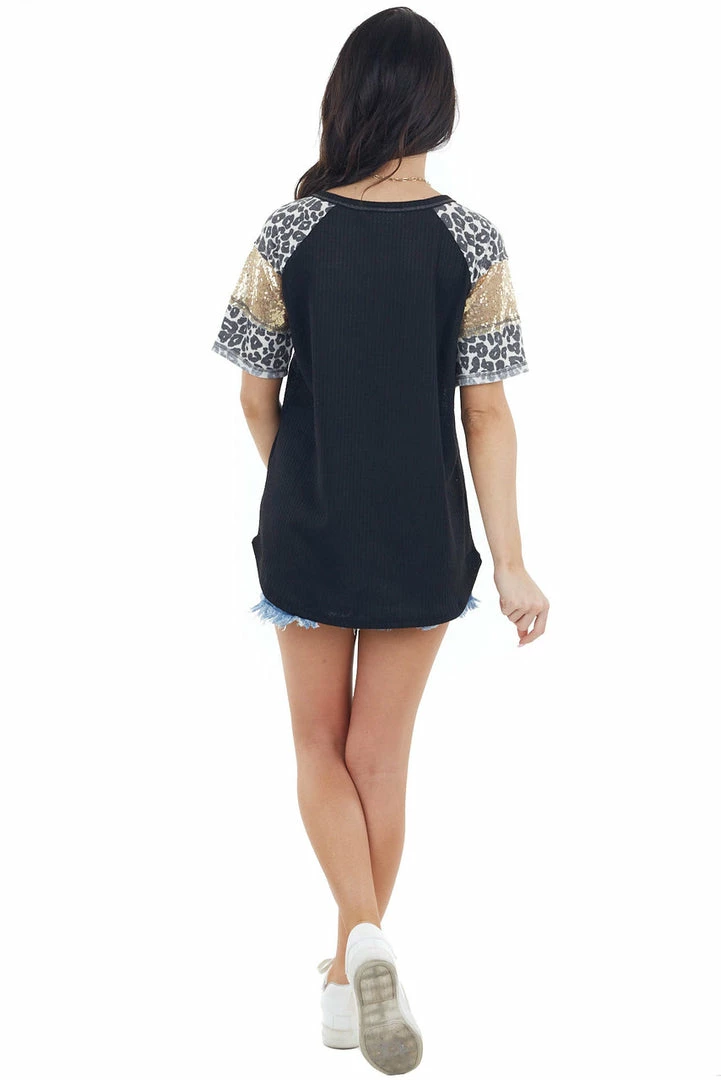 - Black Waffle Knit Top with Leopard and Sequin Contrast