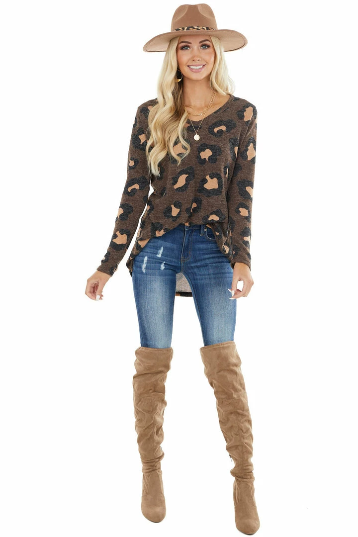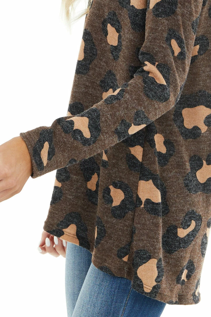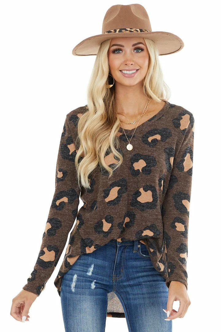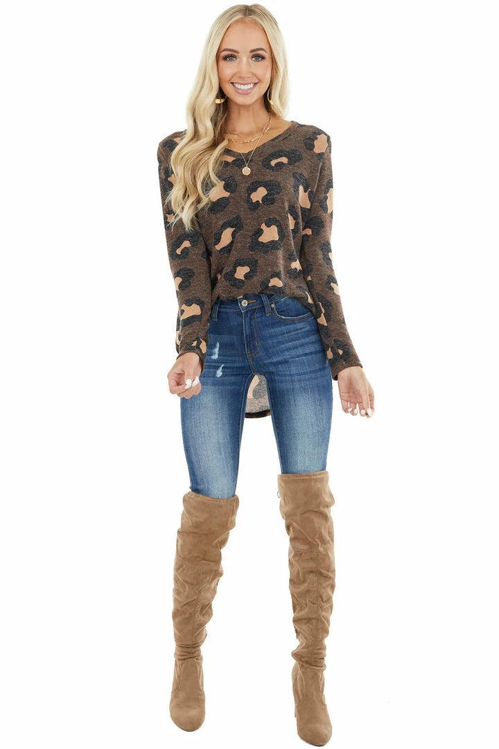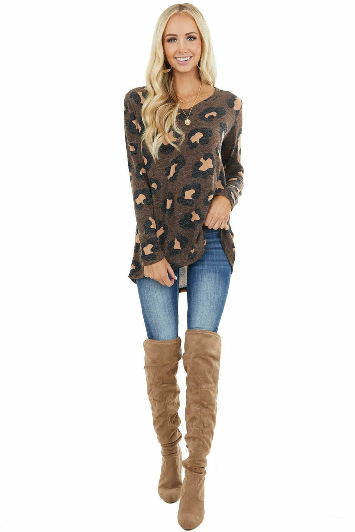 - Chocolate Leopard Print Round Neck Long Sleeve Knit Top