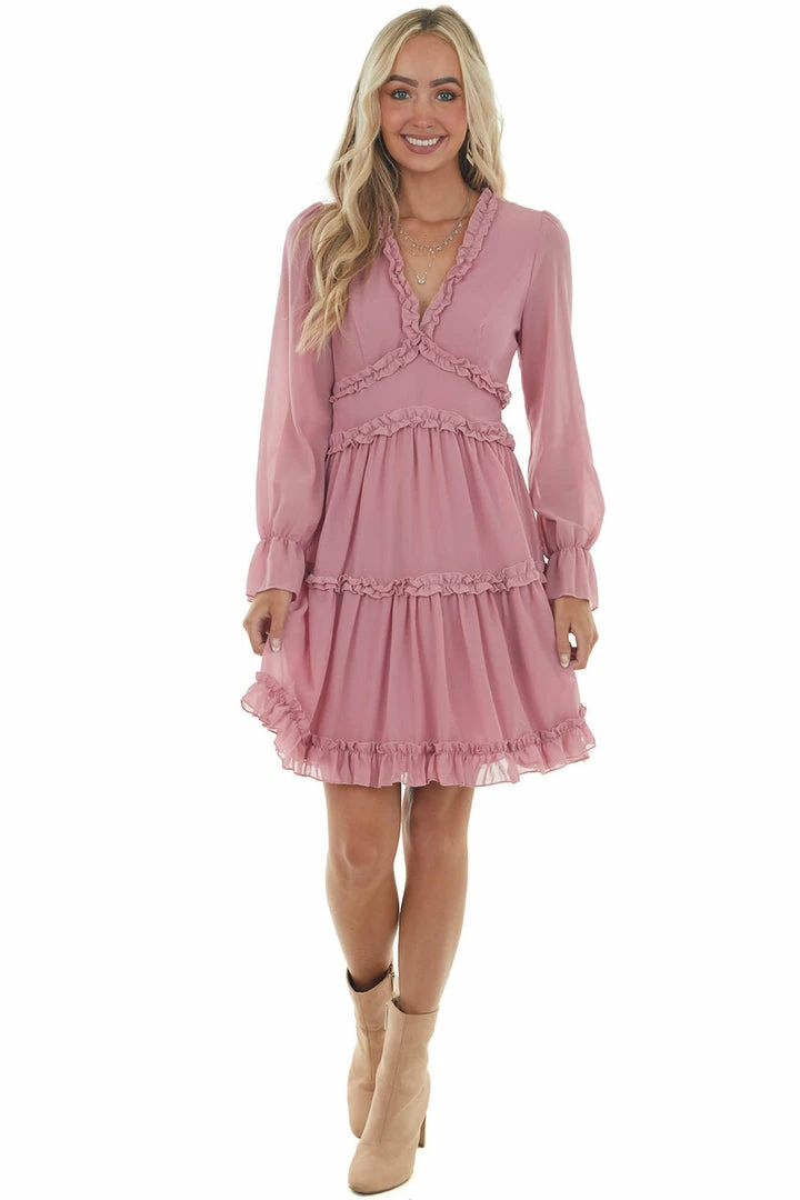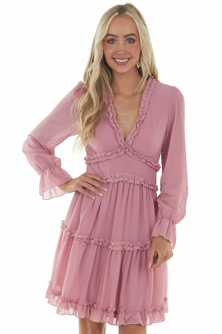 - Dark Blush Sheer Sleeve Frill Tiered Dress