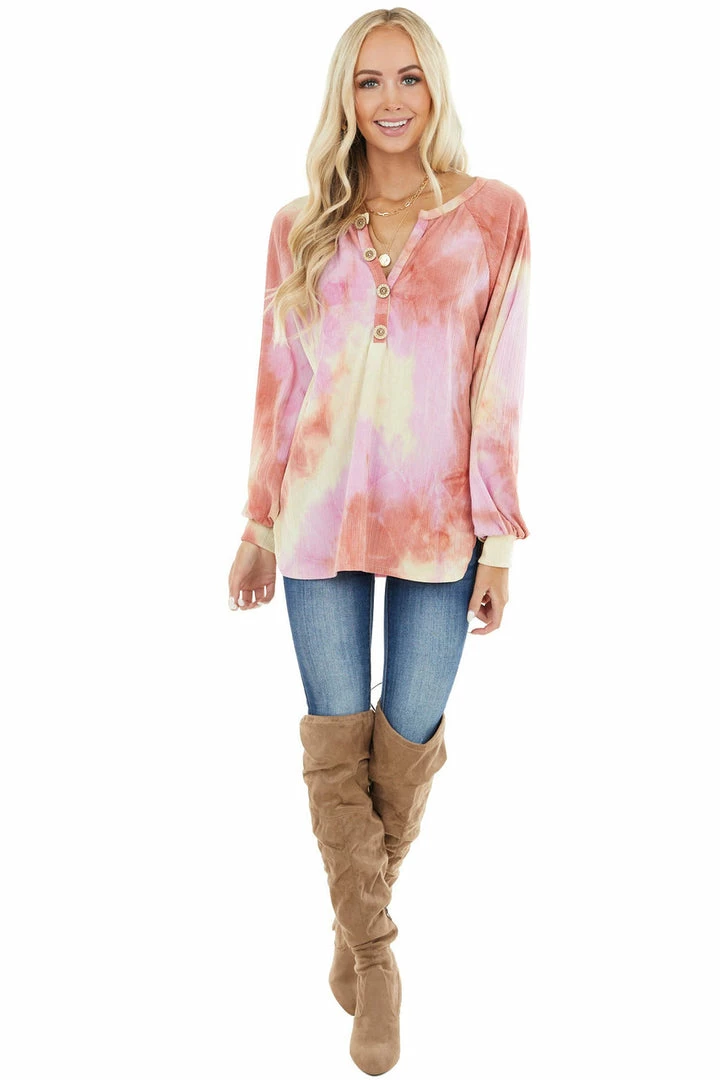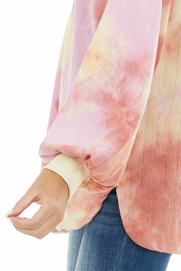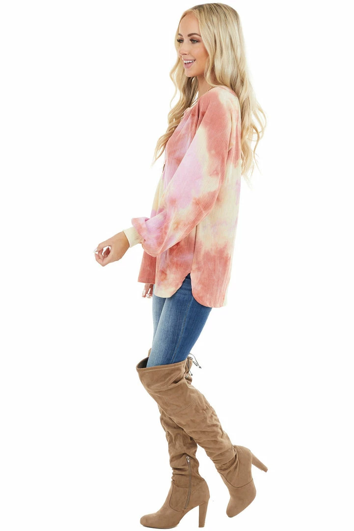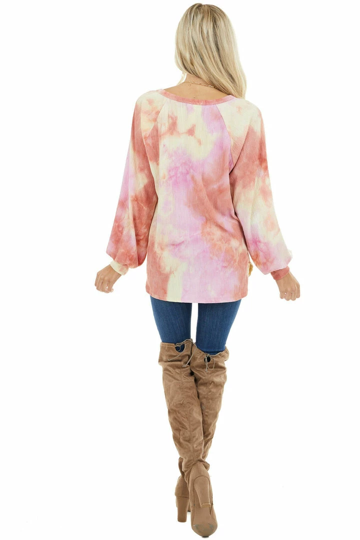- Dark Coral Tie Dye Knit Top with Long Bubble Sleeves