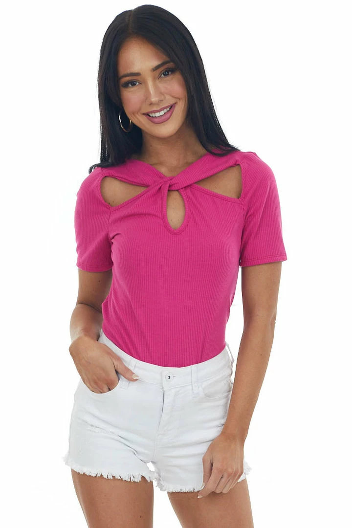 - Magenta Ribbed Knit Top with Front Twist Detail