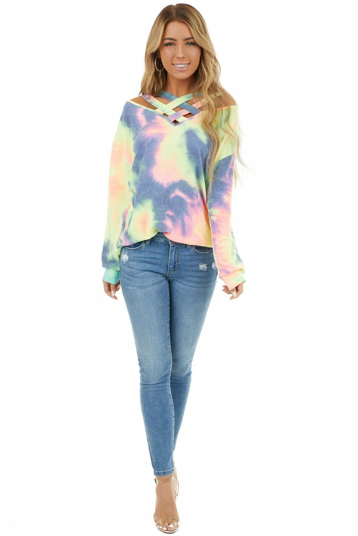- Multi Color Tie Dye Long Sleeve with Criss Cross Neck Detail