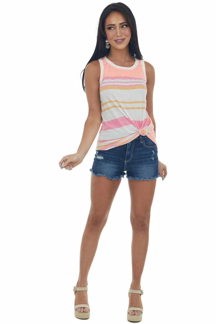 - Neon Coral Striped High Low Knit Tank Top