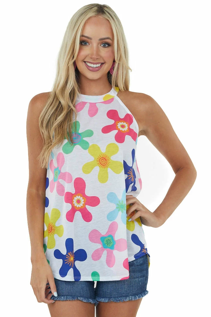 - Off White Abstract Floral Print Halter Neck Knit Tank