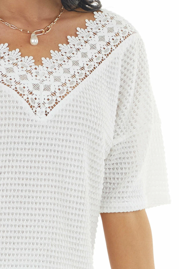 - Off White Waffle Knit V Neck Short Sleeve Top with Lace