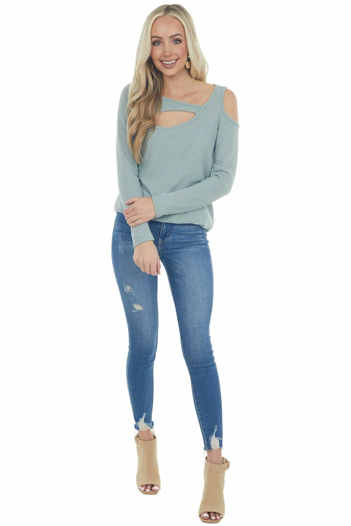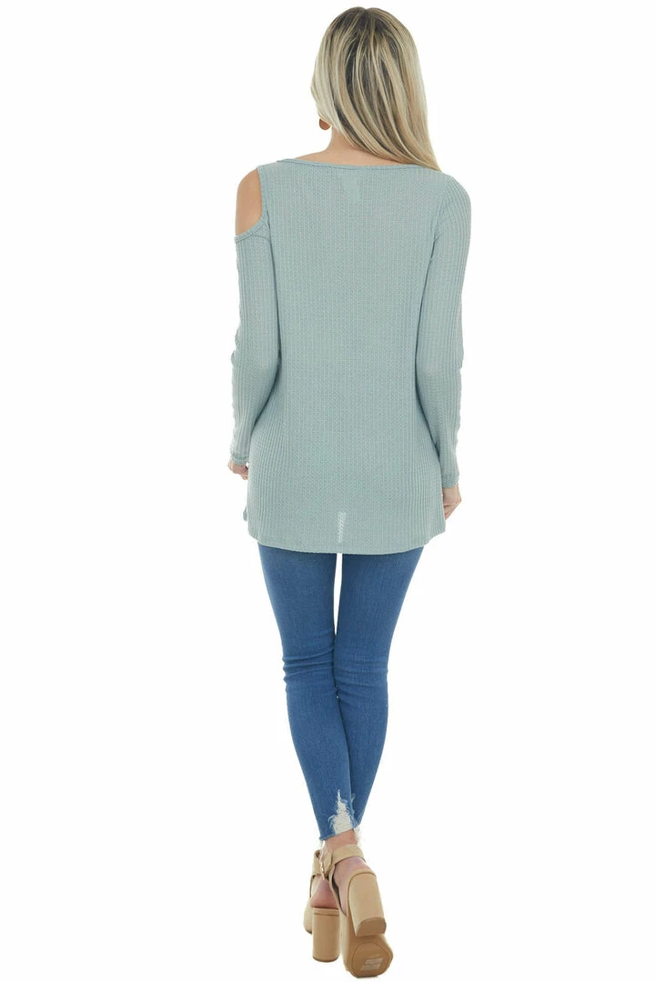 - Seafoam Single Cold Shoulder Waffle Knit Top with Cut Out
