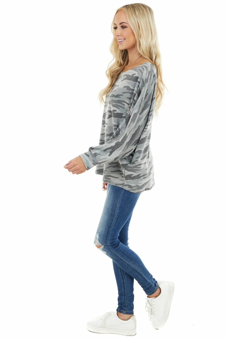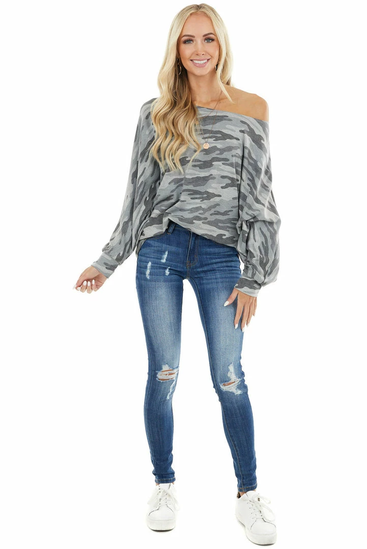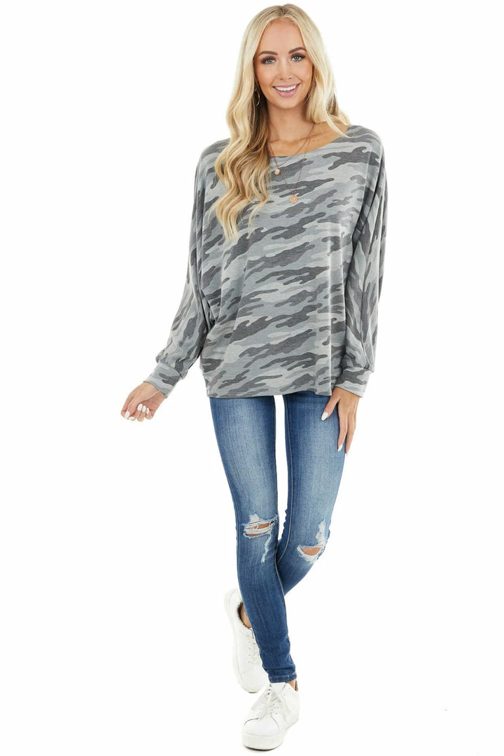 - Charcoal Camo Print Long Dolman Sleeve Knit Top