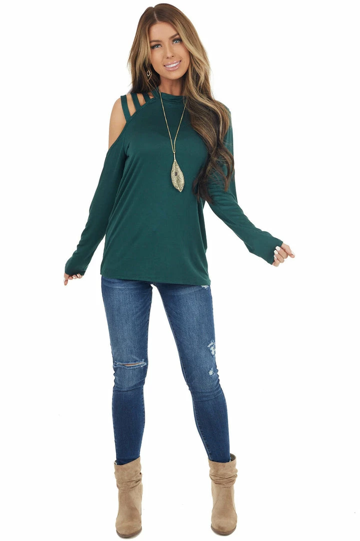- Dark Pine Long Sleeve Knit Top with One Caged Cold Shoulder