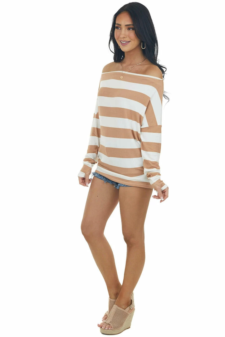 - Ivory and Light Caramel Boat Neckline Knit Top