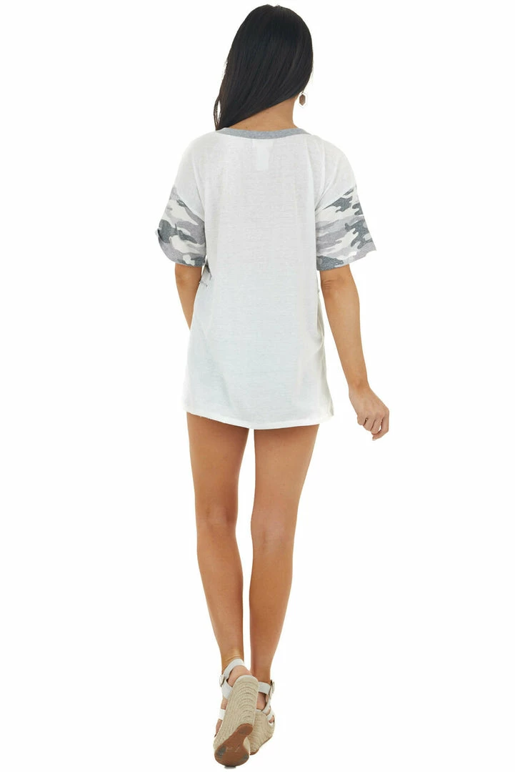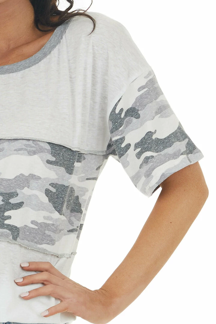 - Ivory Camo Print Short Sleeve Knit Top with Stitching Detail