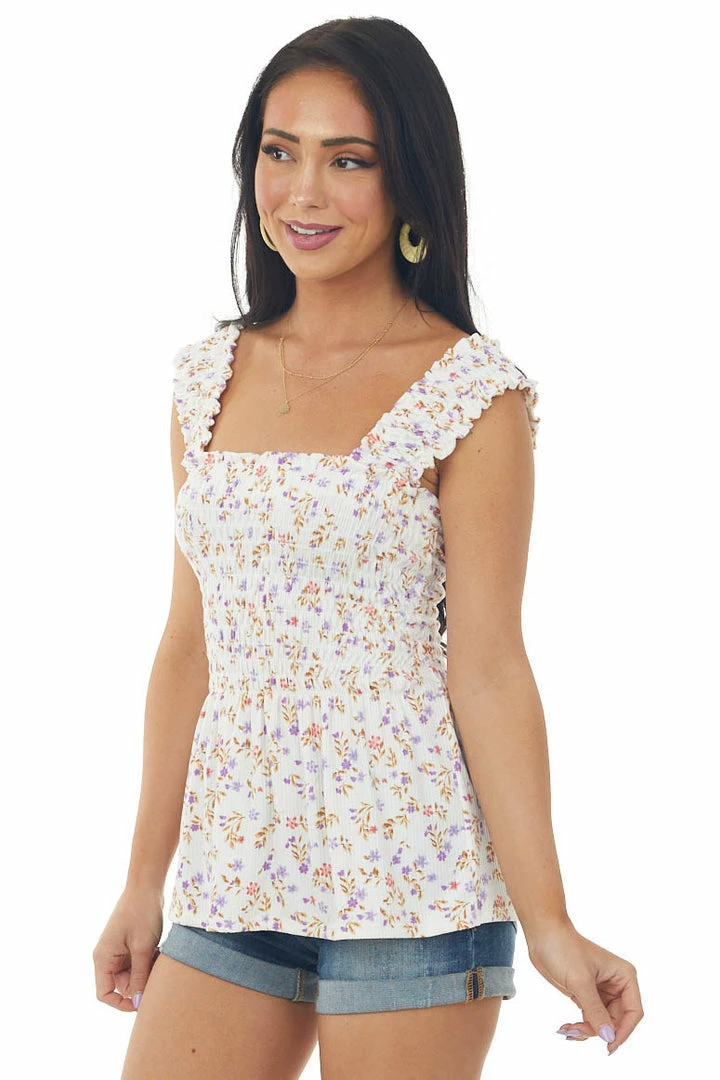 - Off White Floral Print Smocked Peplum Tank Top