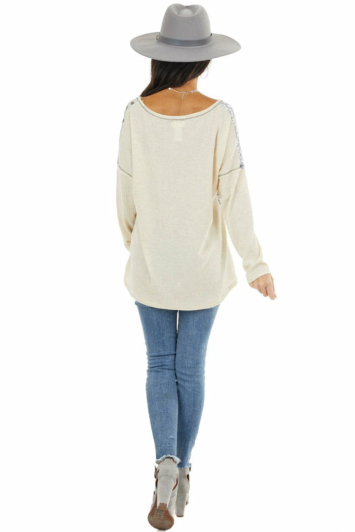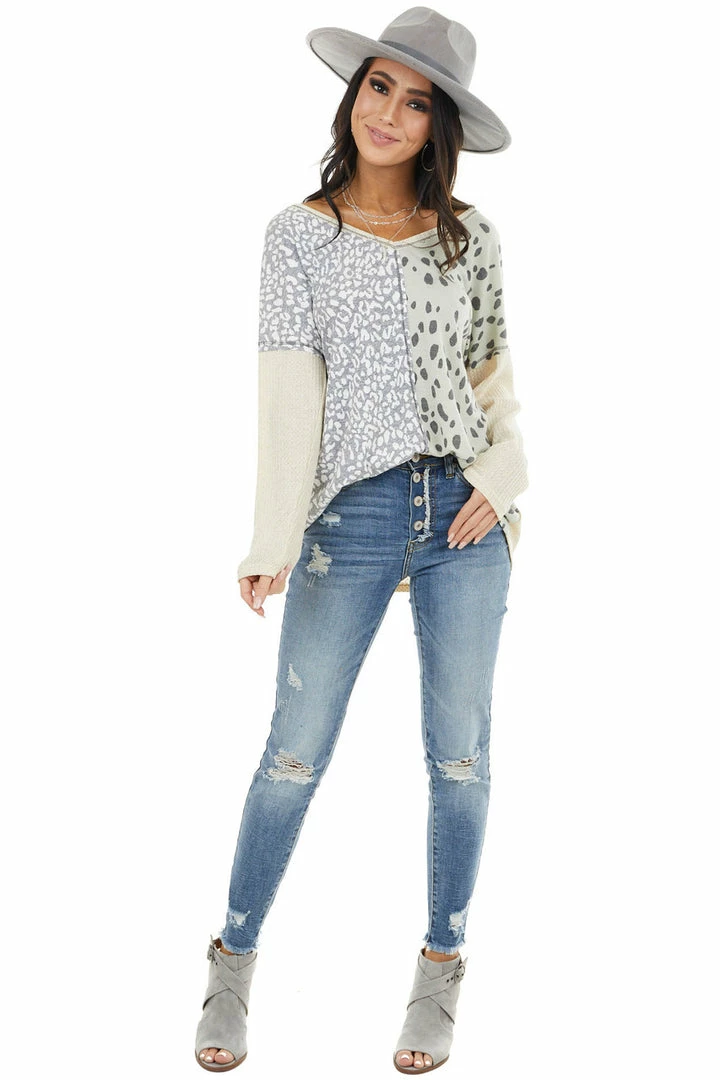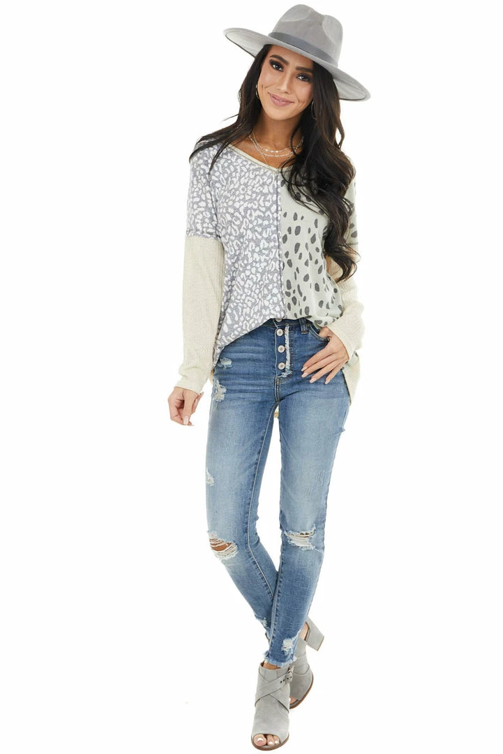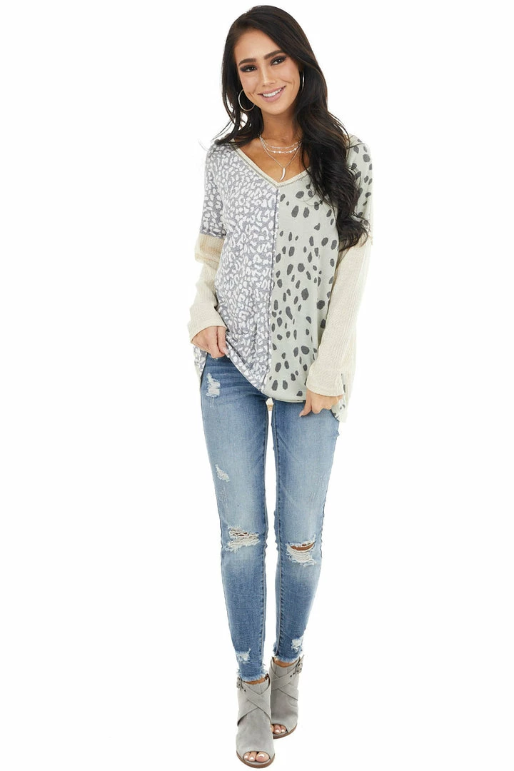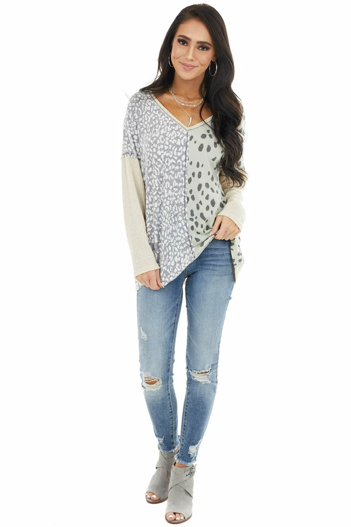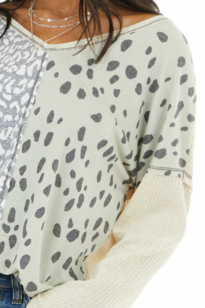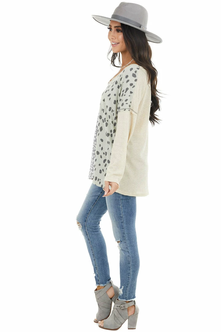 - Sand Waffle Knit Top with Sage Leopard Print Contrast