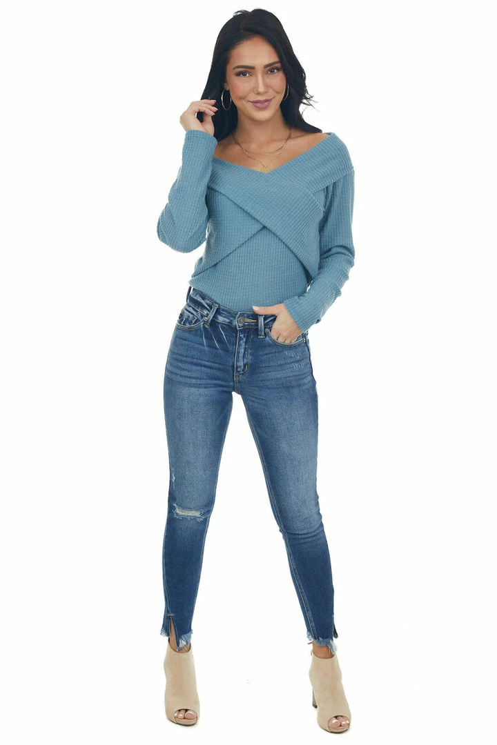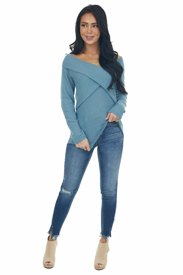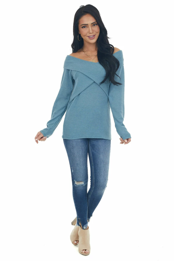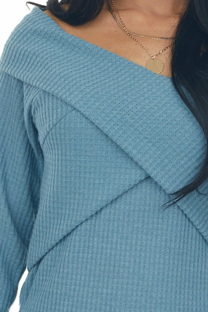 - Steel Blue Criss Cross Brushed Waffle Knit Top