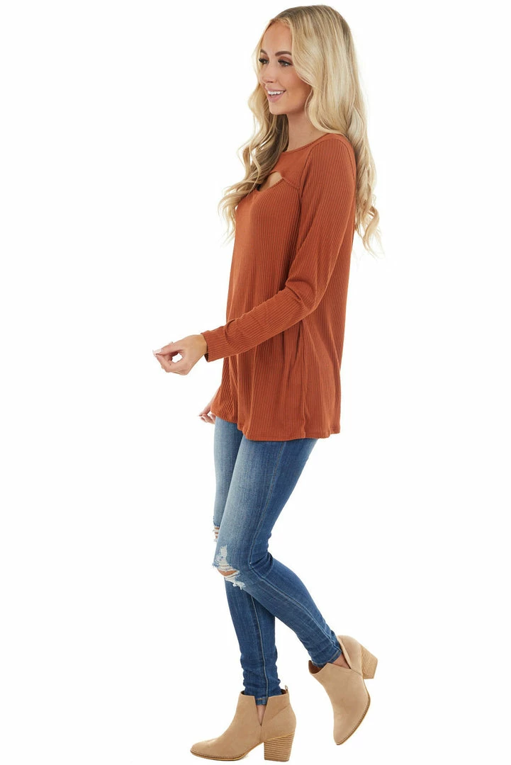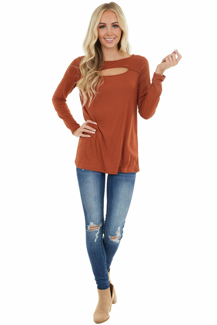 - Terracotta Soft Ribbed Long Sleeve Top with Neckline Cutout