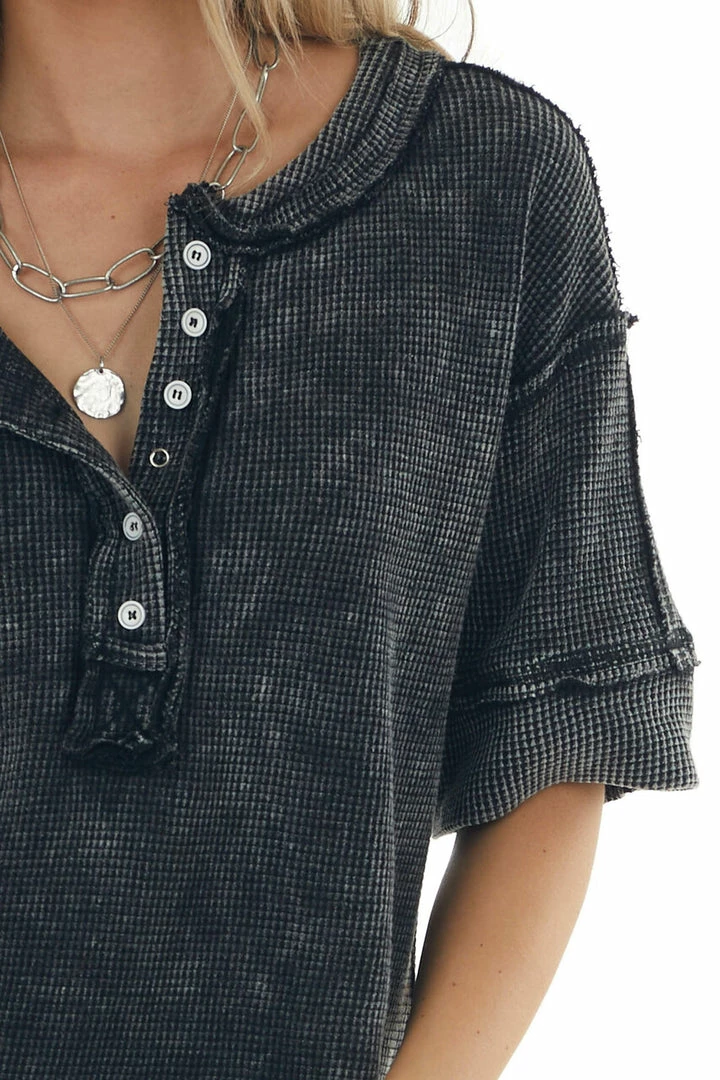 - Washed Black Button Up Rounded Hem Thermal Top