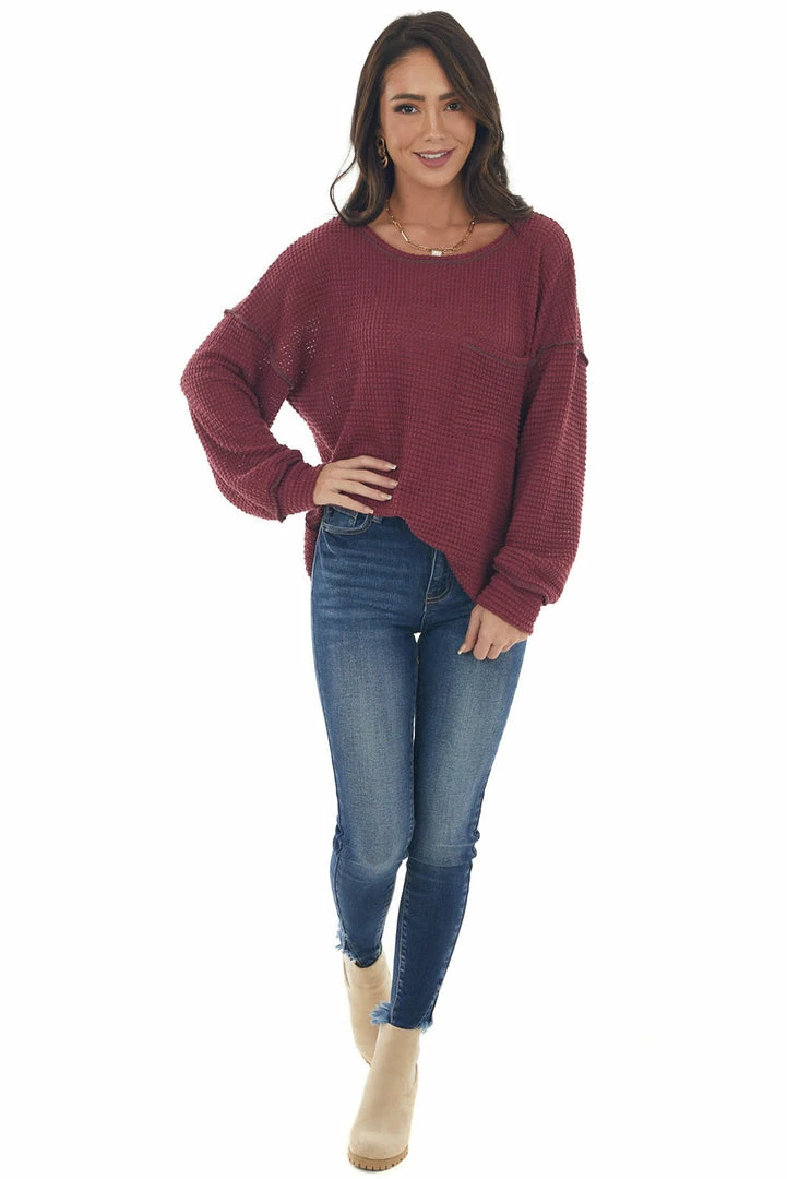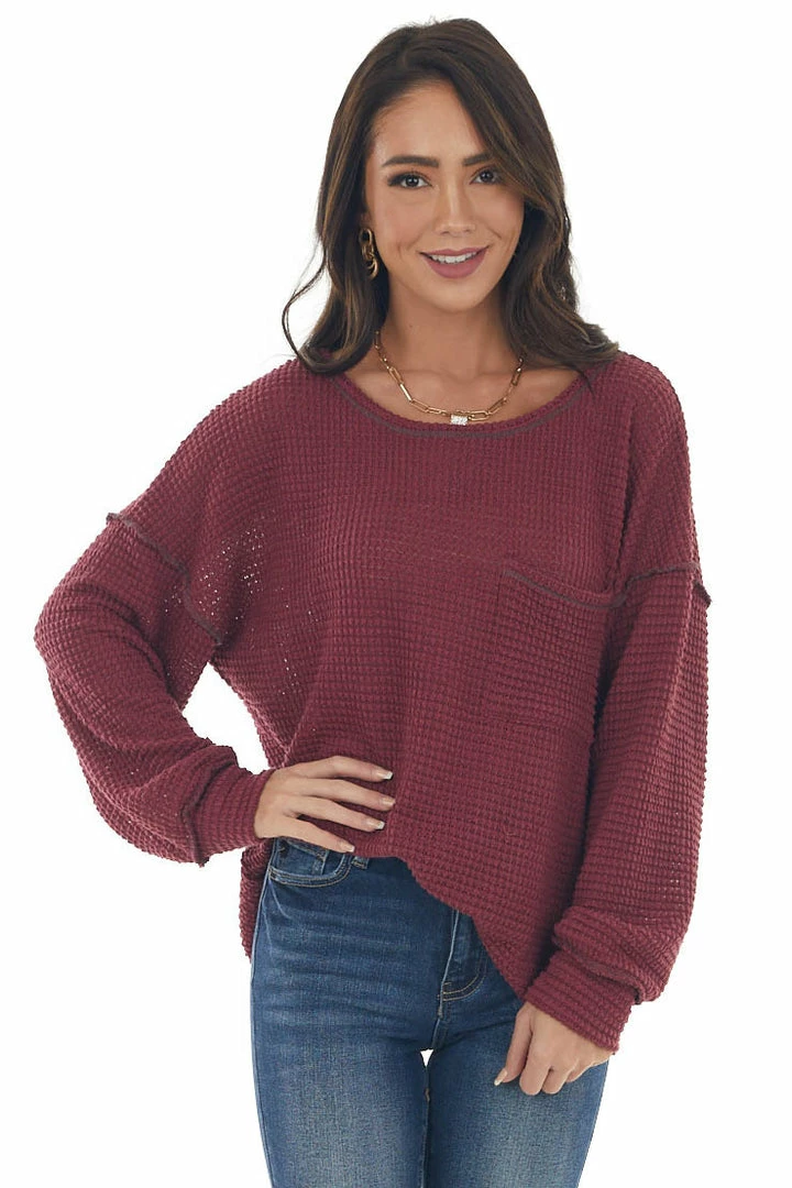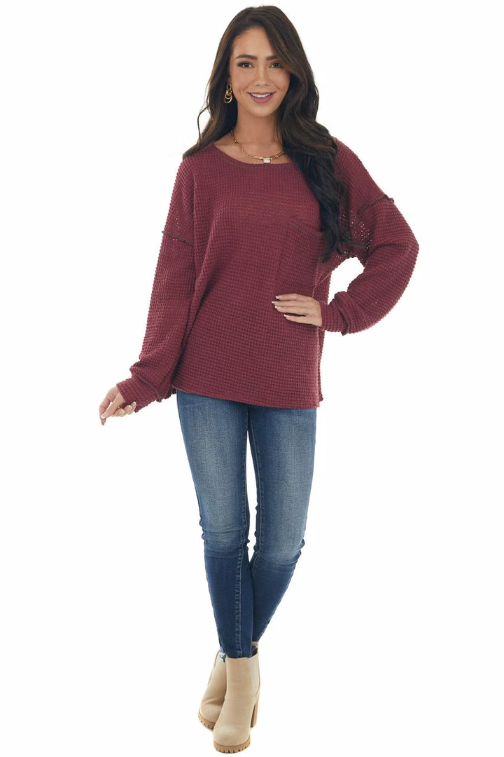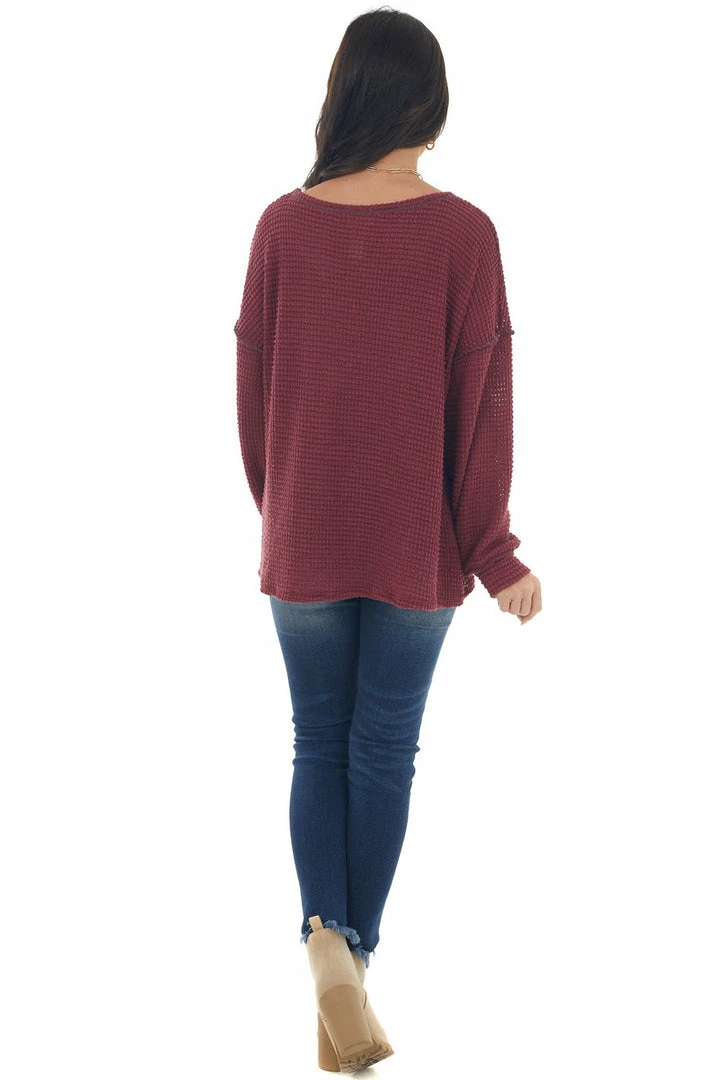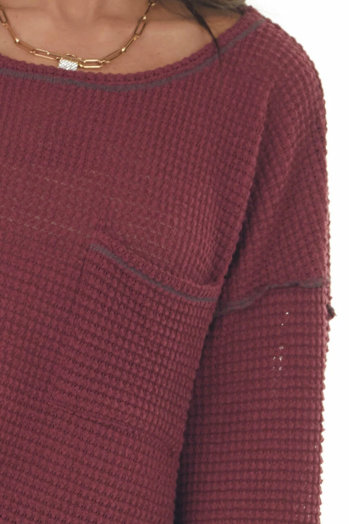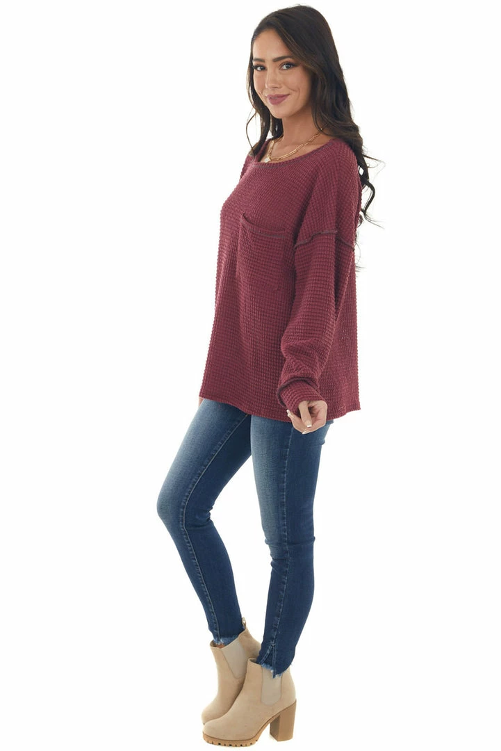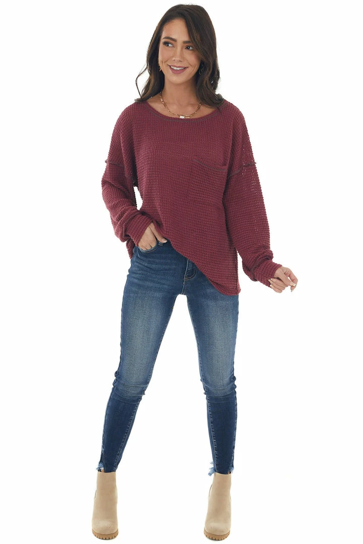 - Wine Loose Waffle Knit Chest Pocket Top