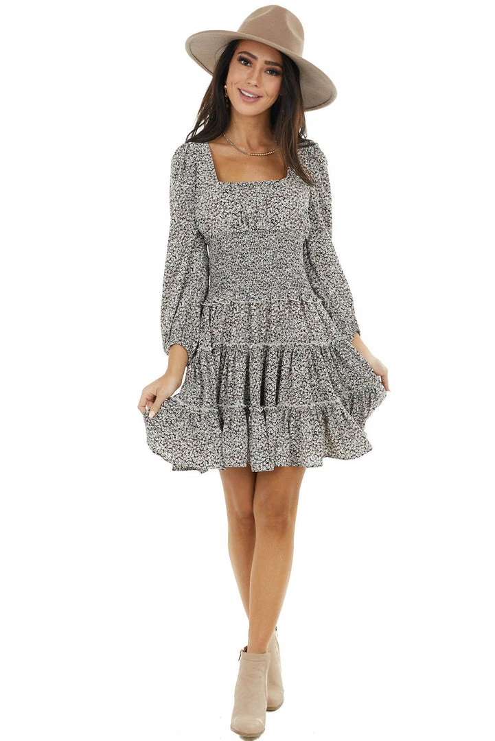 - Black Floral Print Tiered Woven Dress with Smocked Waist