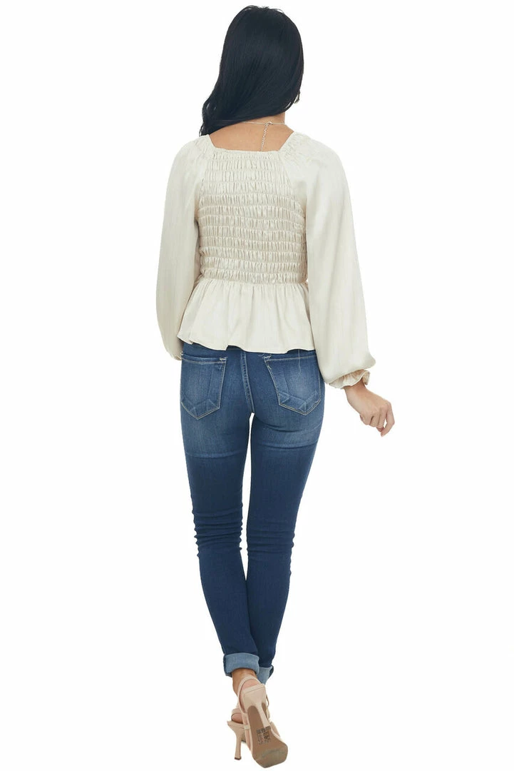 - Champagne Smocked Bubble Sleeve V Neck Blouse