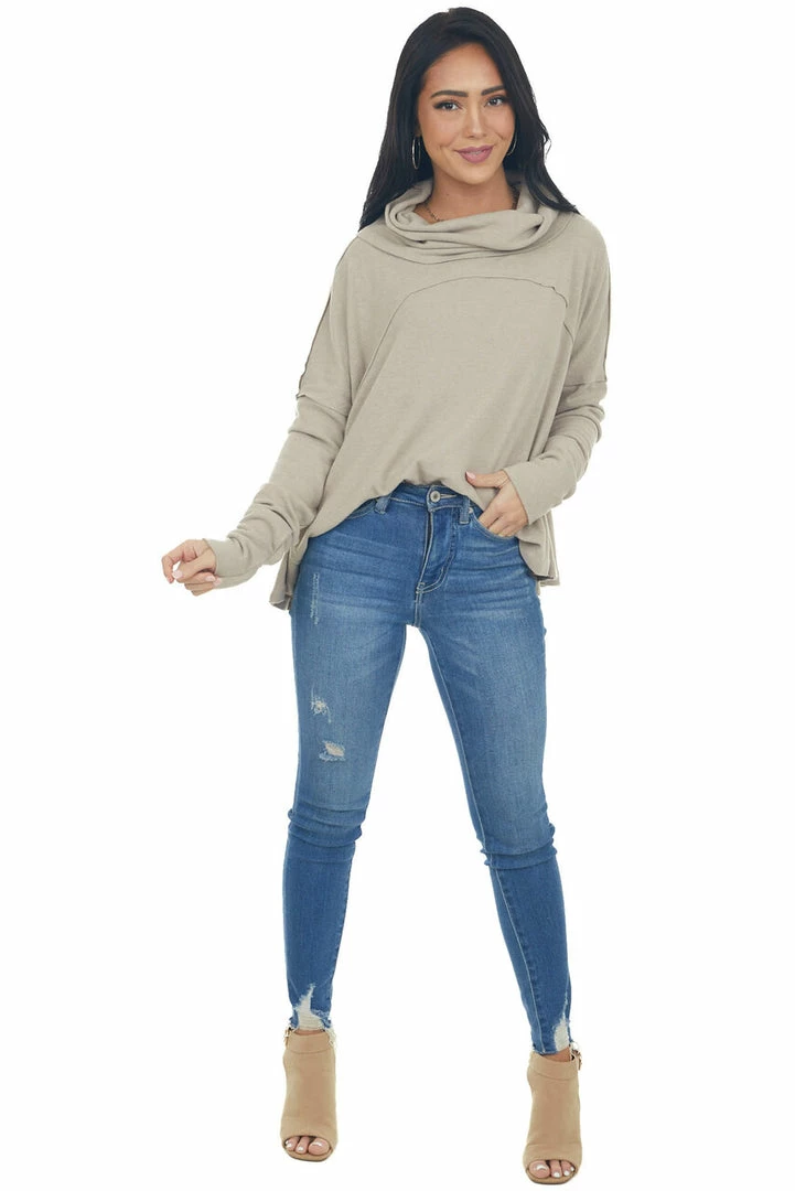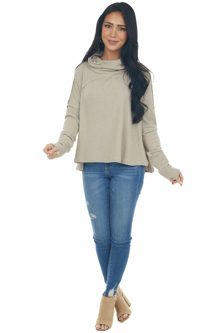 - Oatmeal Cowl Neck Long Sleeve Brushed Knit Top
