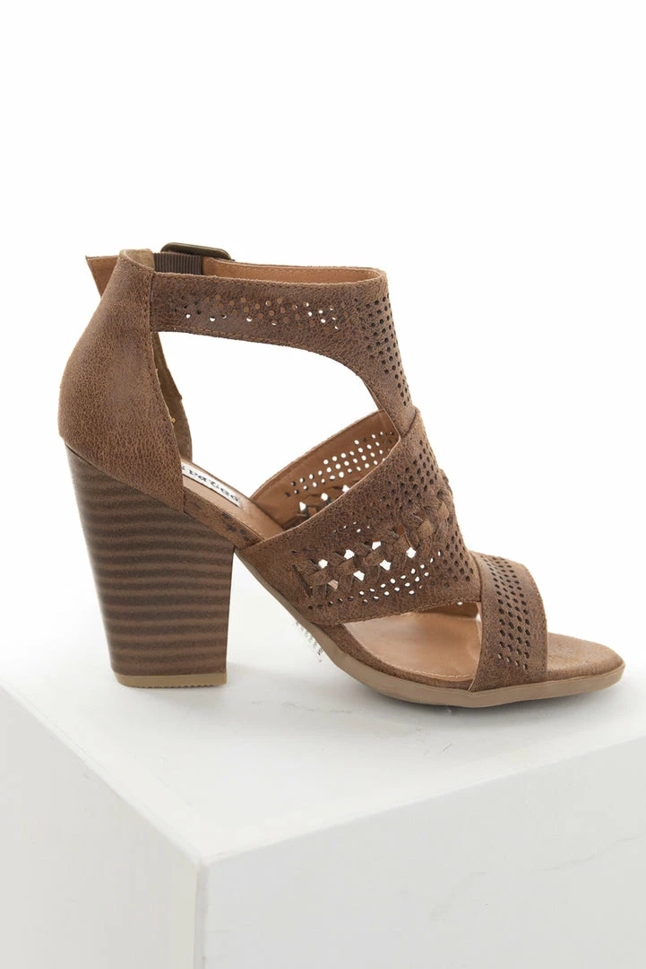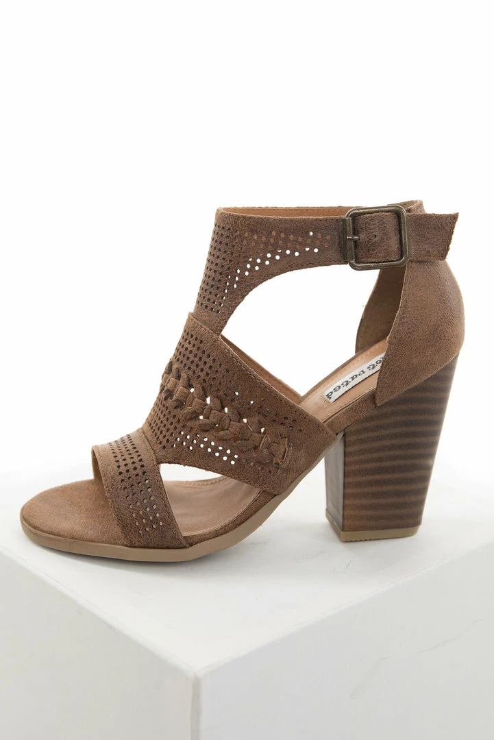 - Walnut Faux Suede Open Toe High Heel with Buckle Detail