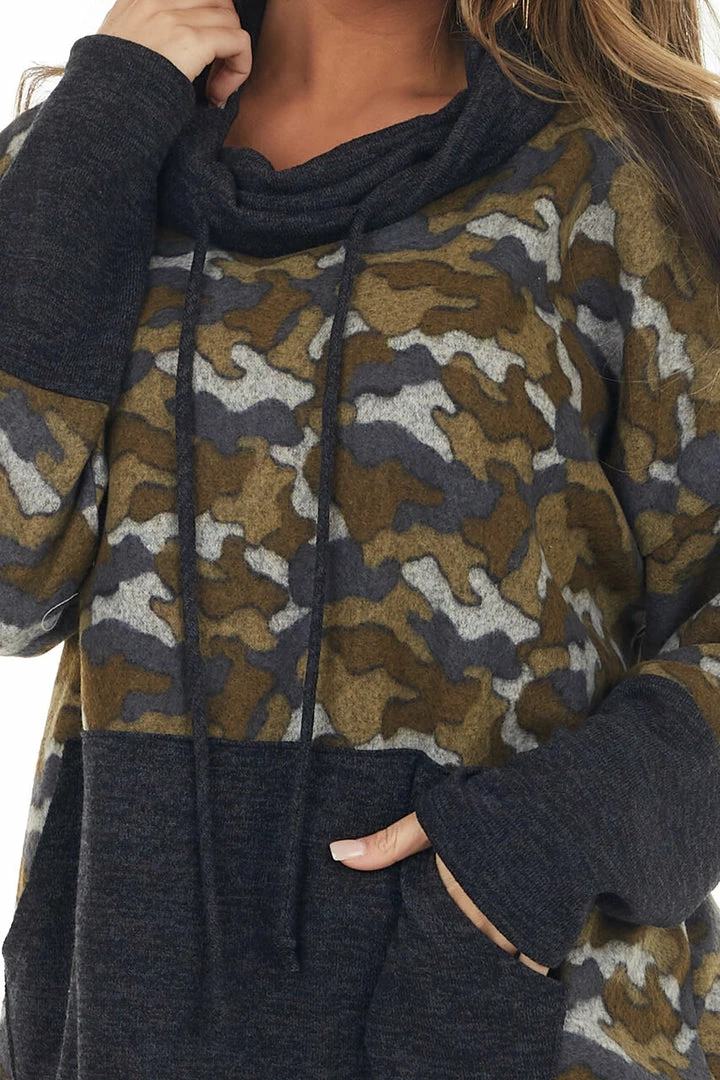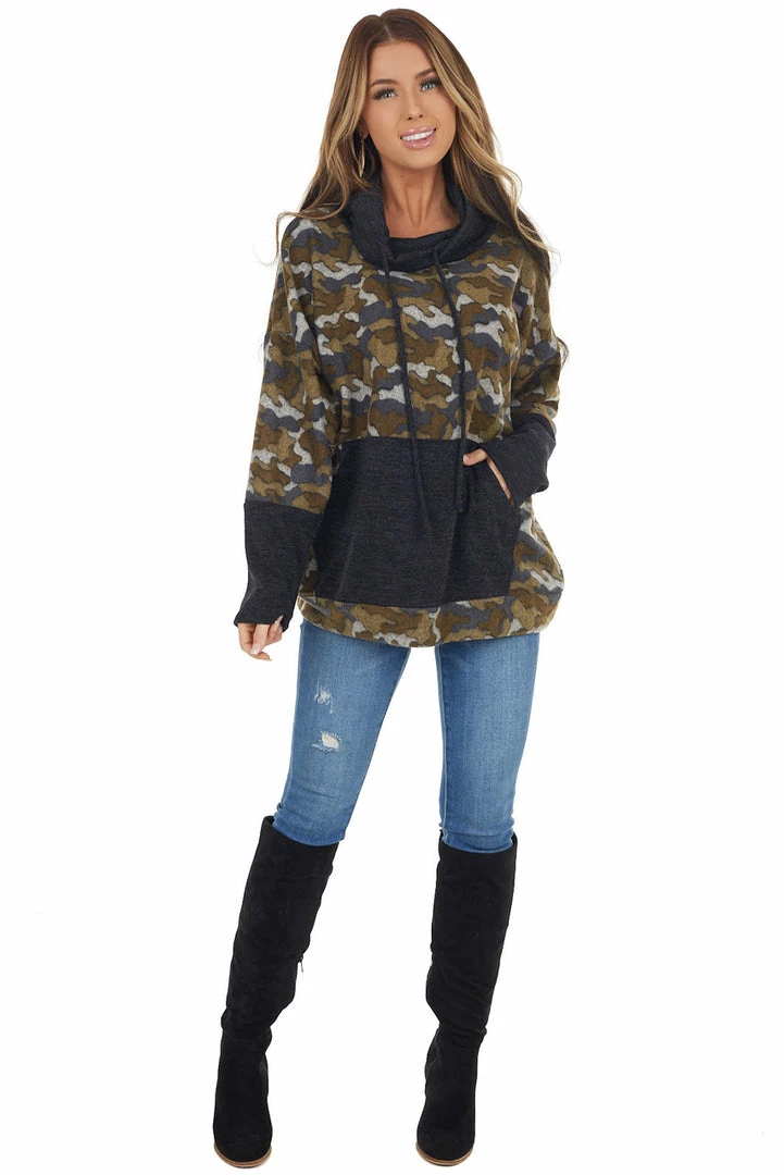 - Olive Camo Print Pullover with Cowl Neck and Kangaroo Pouch