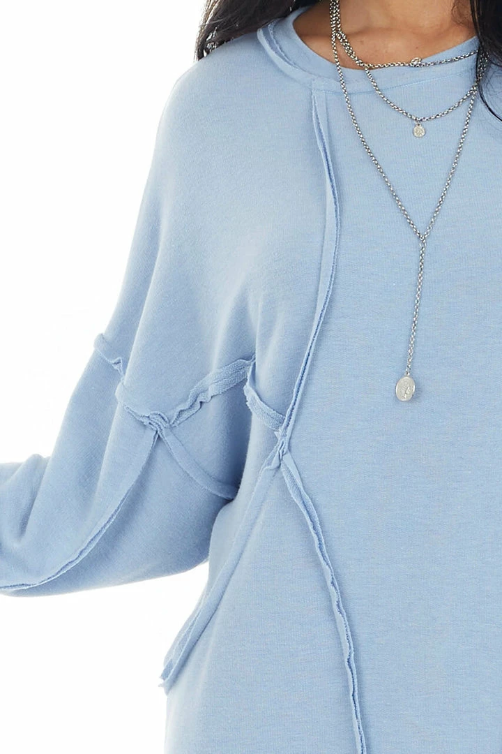 - Powder Blue French Terry Knit Top with Raw Edge Details