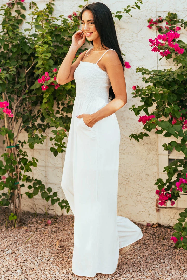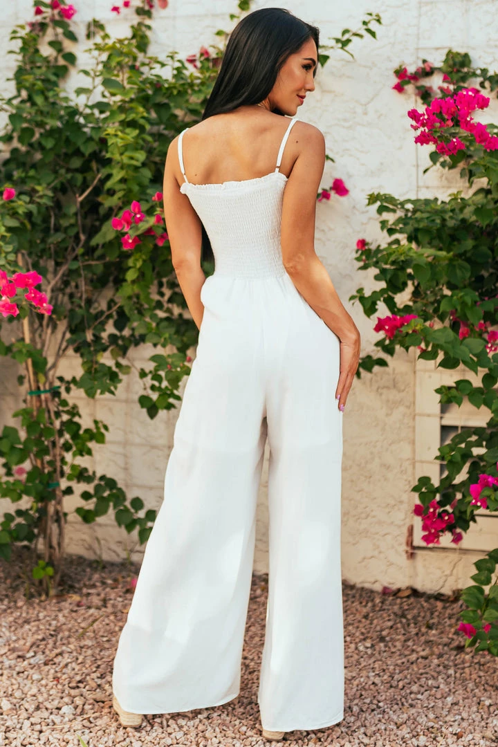 - Ivory Sleeveless Smocked Wide Leg Linen Jumpsuit