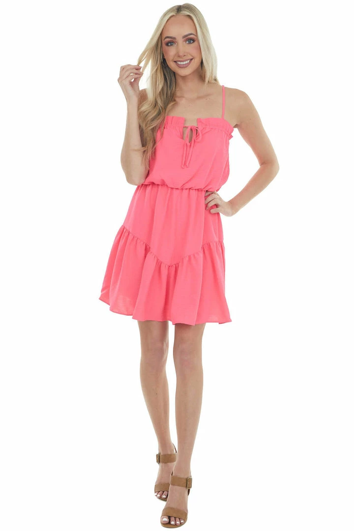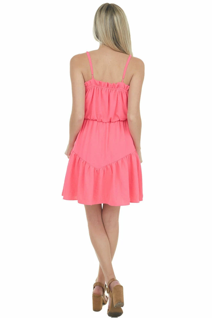 - Neon Pink Sleeveless Tiered Short Woven Dress
