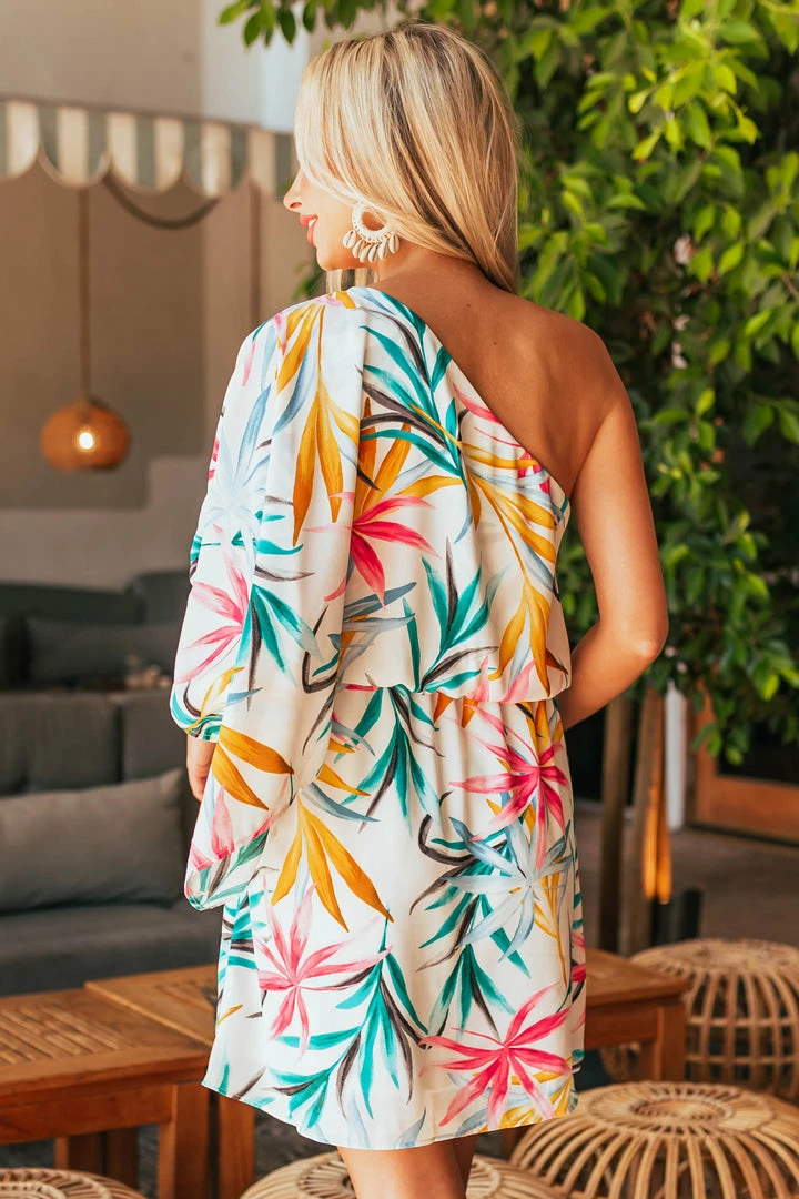 - Off White Tropical Print One Shoulder Short Dress