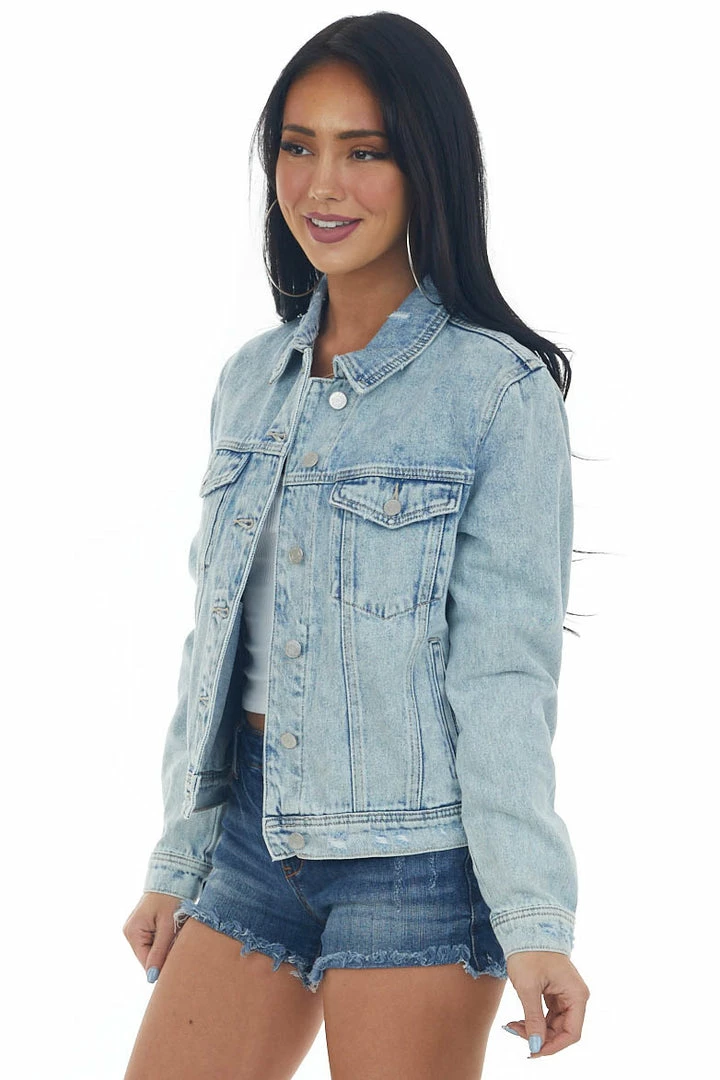 - Light Wash Distressed Button Up Denim Jacket