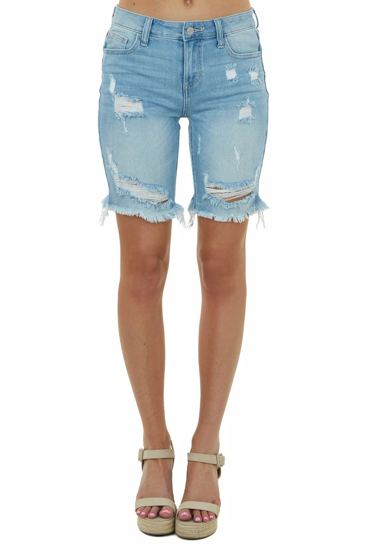 - Light Wash Frayed Hem Bermuda Denim Shorts