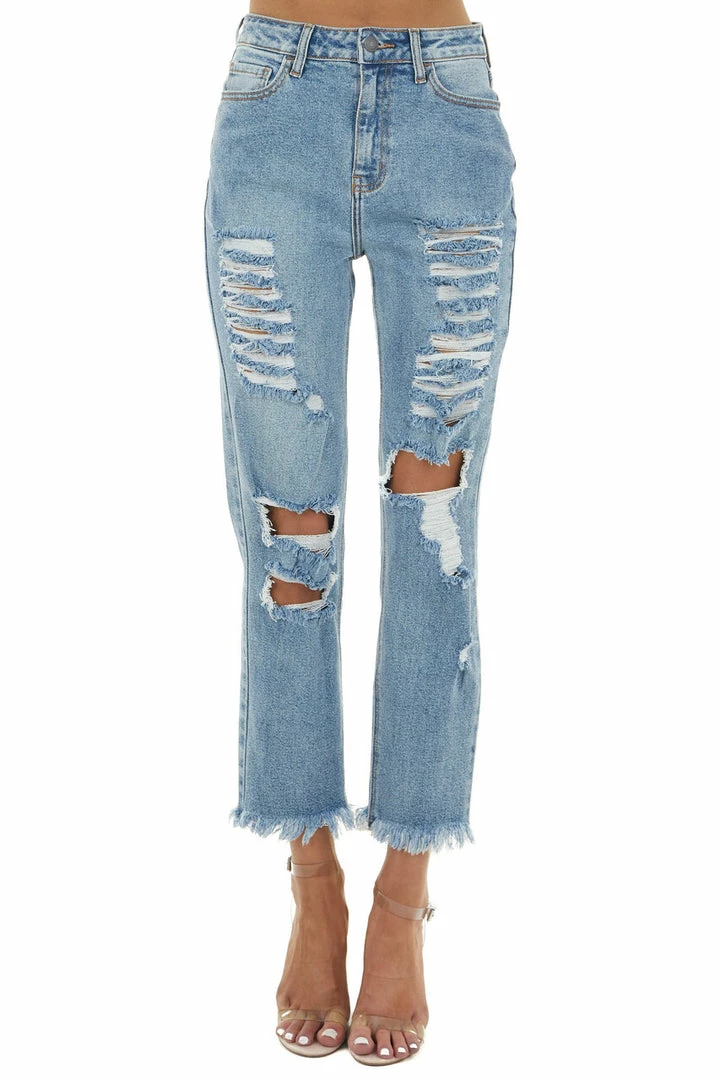 - Medium Wash Distressed High Rise Jeans with Frayed Detail