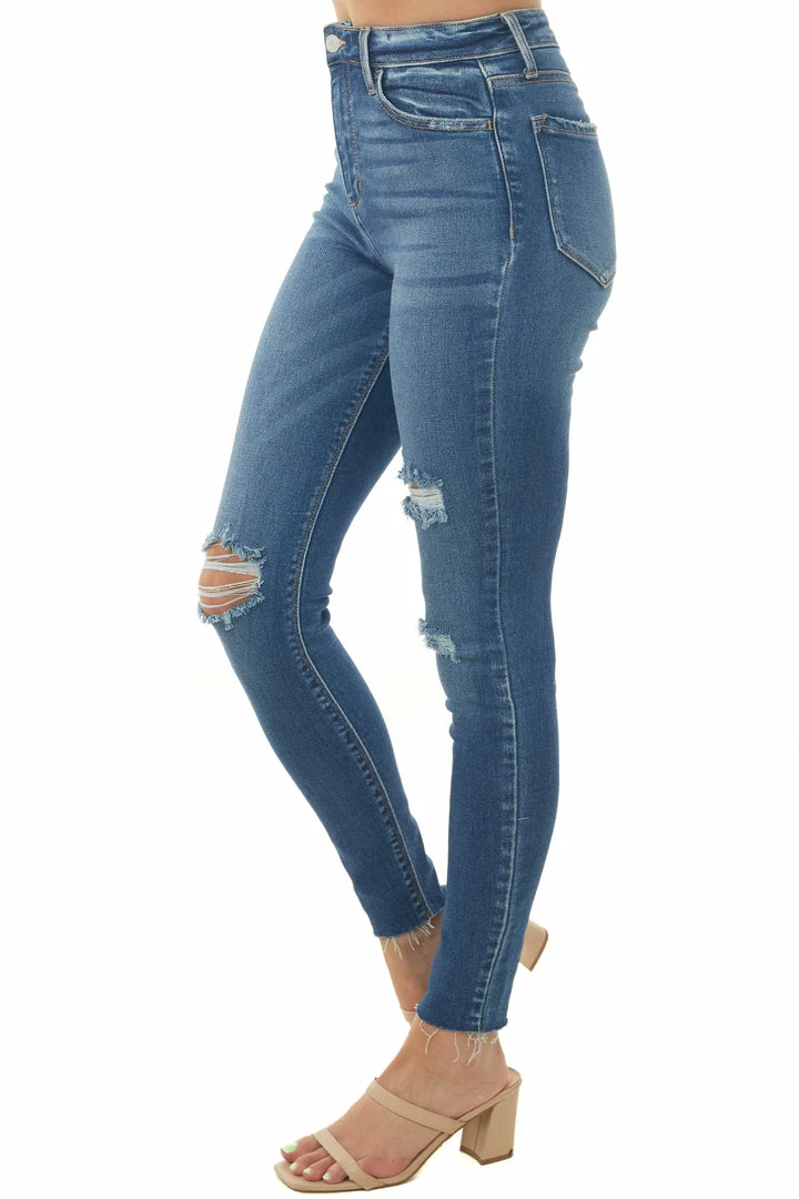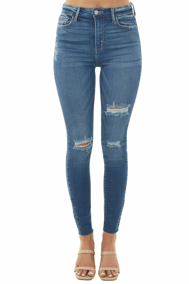 - Medium Wash High Rise Distressed Jeans with Raw Hem