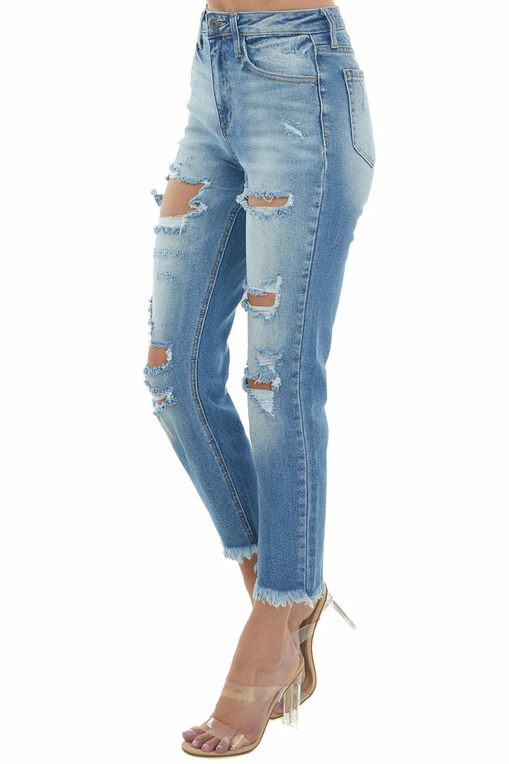 - Medium Wash High Rise Raw Hem Distressed Jeans