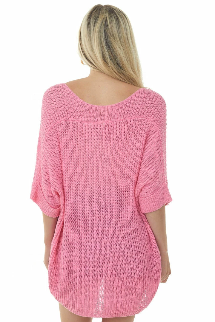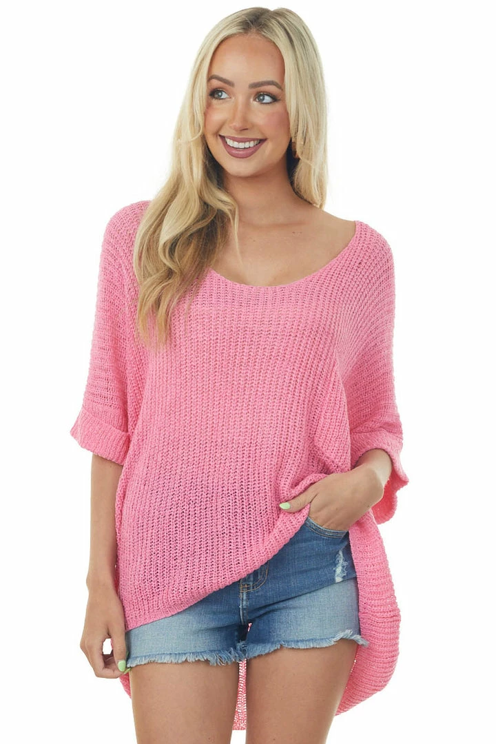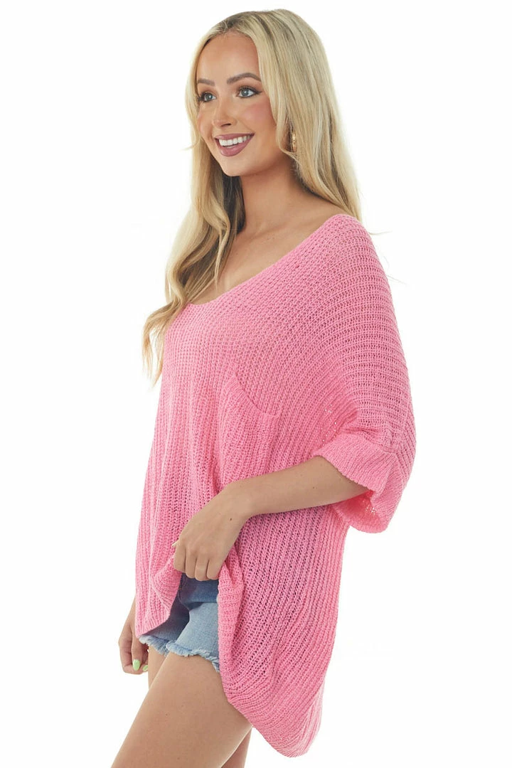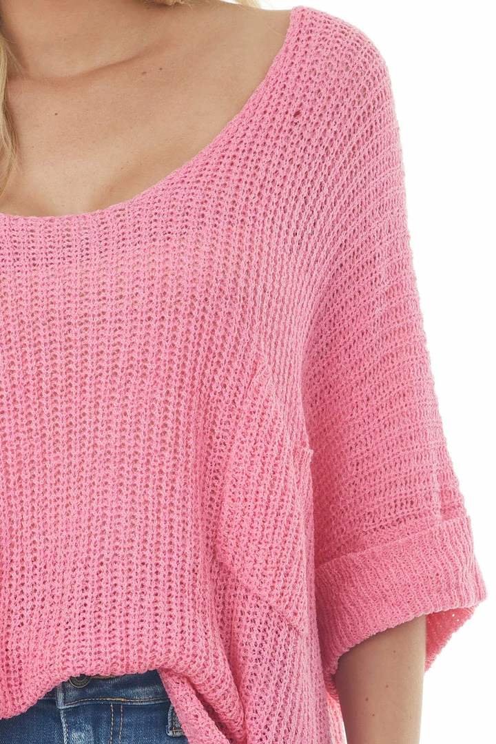 - Bubblegum Rolled Cuff Loose Knit Top with Pocket