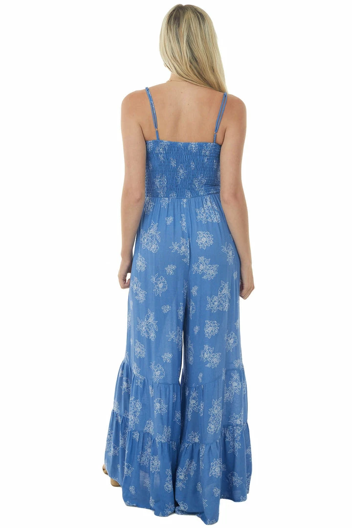 - Dusty Blue Floral Sleeveless Smocked Jumpsuit