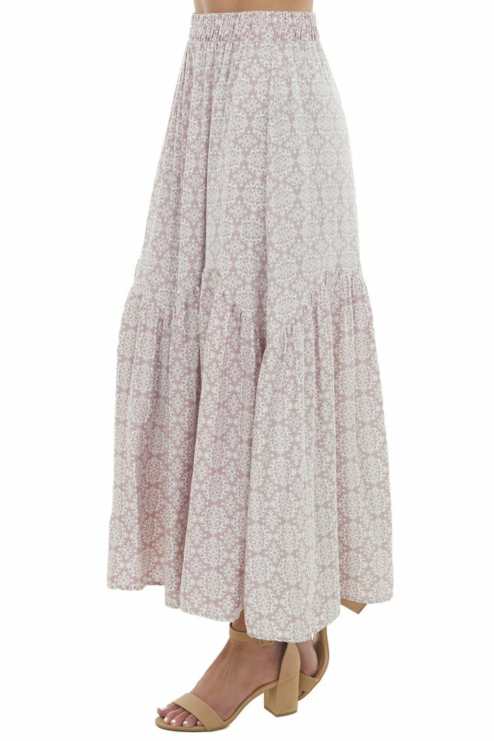 - Dusty Rose Printed Tiered Woven Maxi Skirt