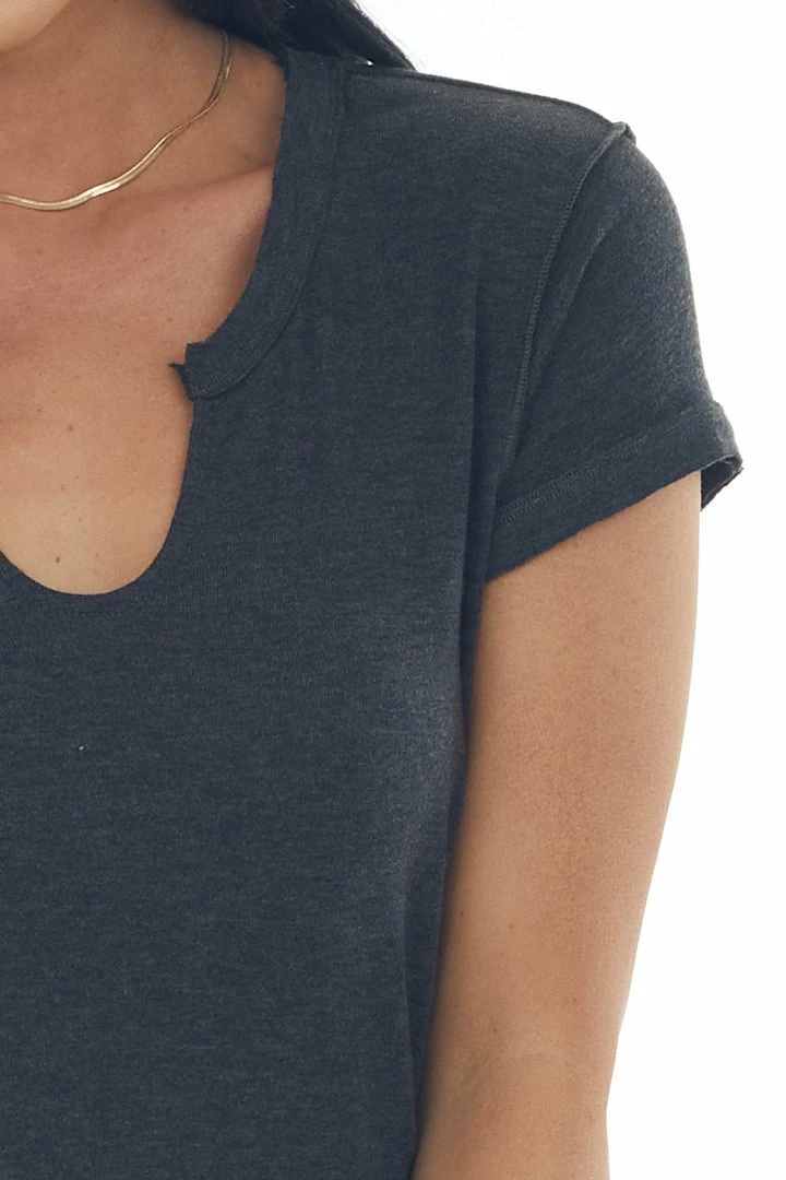 - Charcoal Raw Edge Notch Neck Light Knit Top