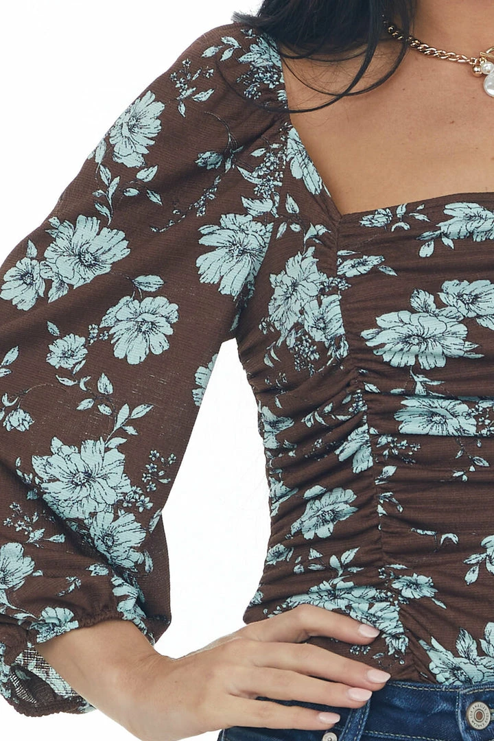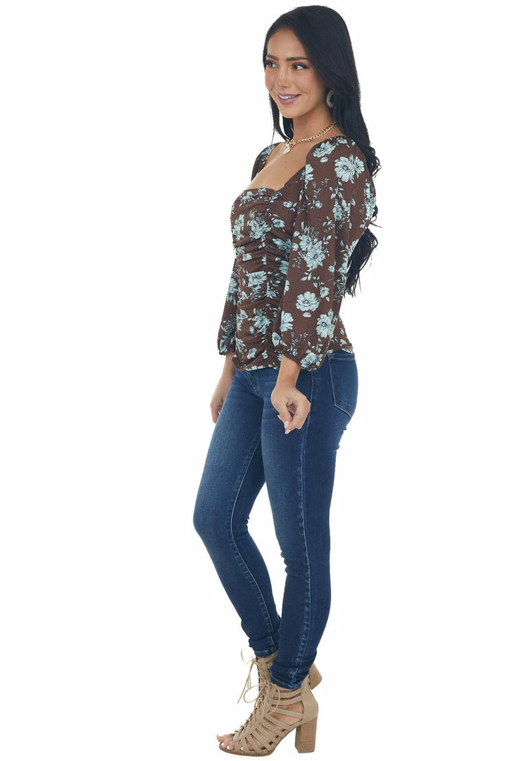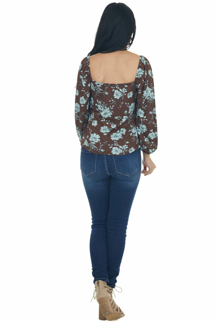 - Cocoa and Sky Blue Floral Peasant Sleeve Top