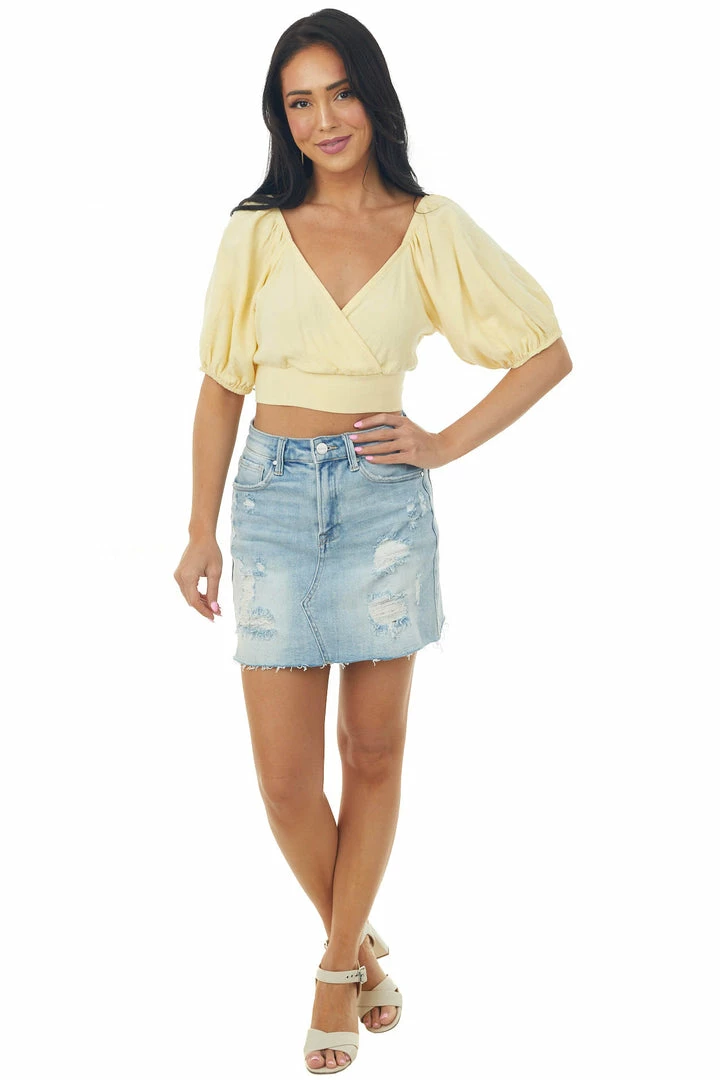 - Pastel Yellow Puff Sleeve Surplice Tie Back Top